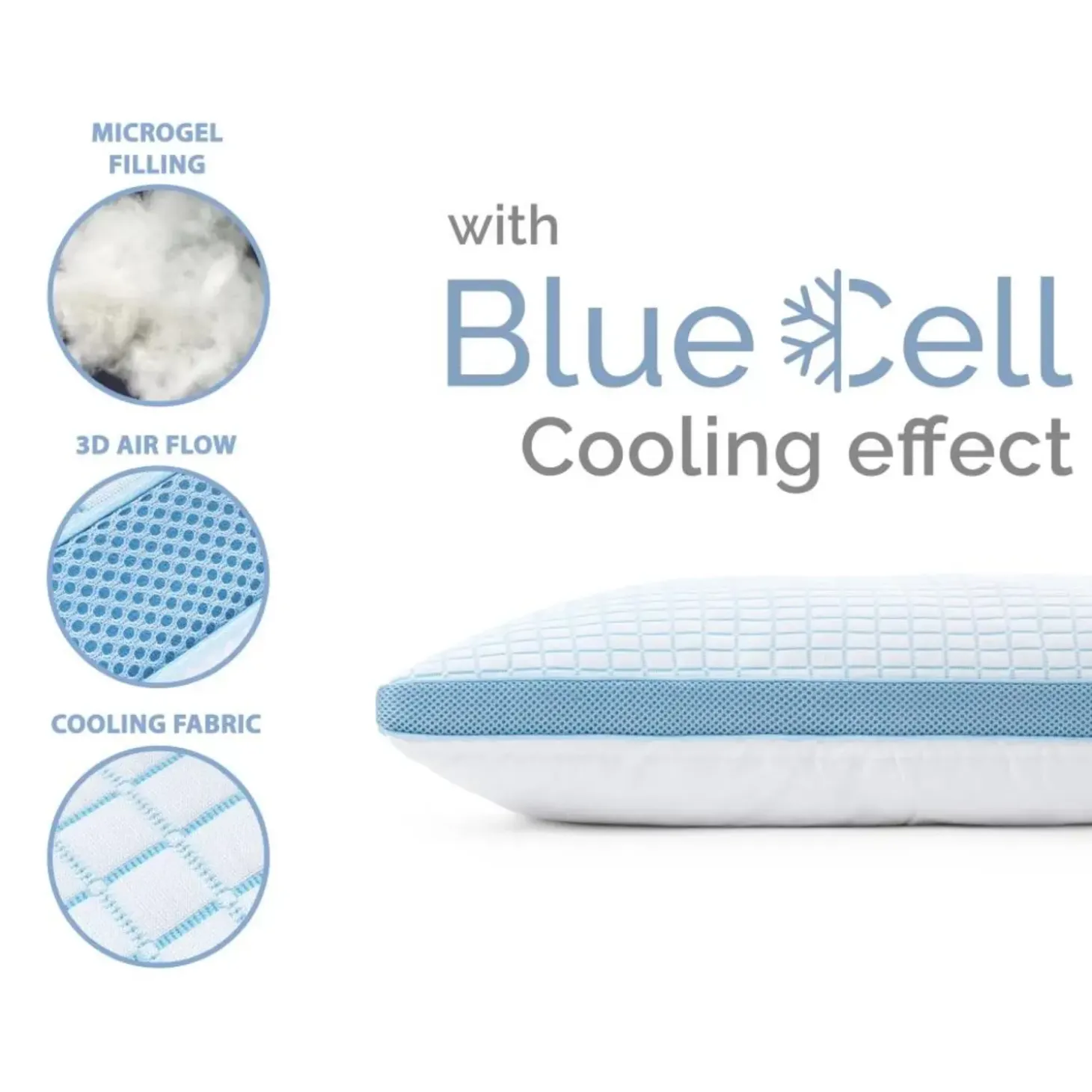 De innovatieve bovenzijde van de tijk van BlueCell-technology bestaat uit 55% nylon/45% polyester en de onderzijde heeft 100% percale katoen. Dit verkoelende kussen is gevuld met 50% EcoDown en 50% polyester holle vezels en heeft een fijne afwerking.