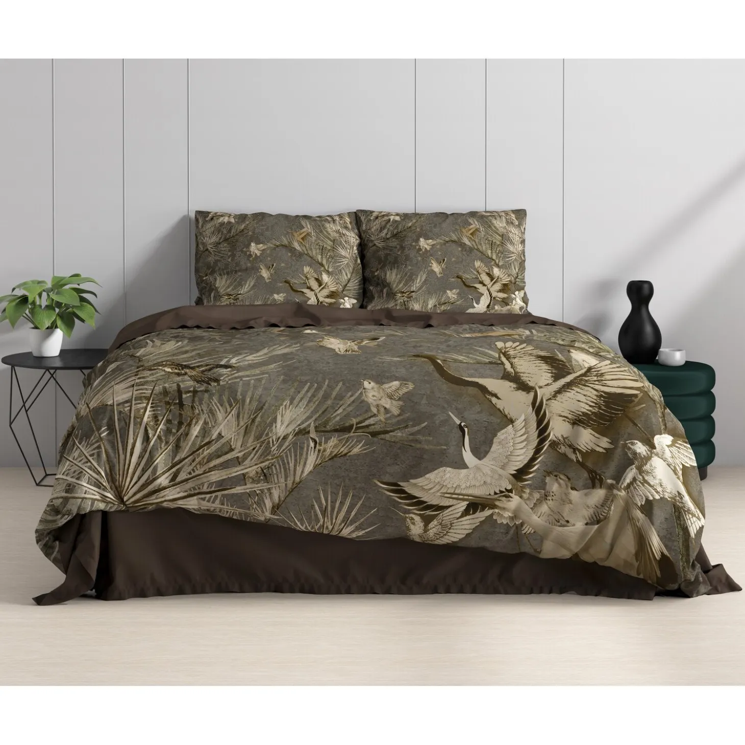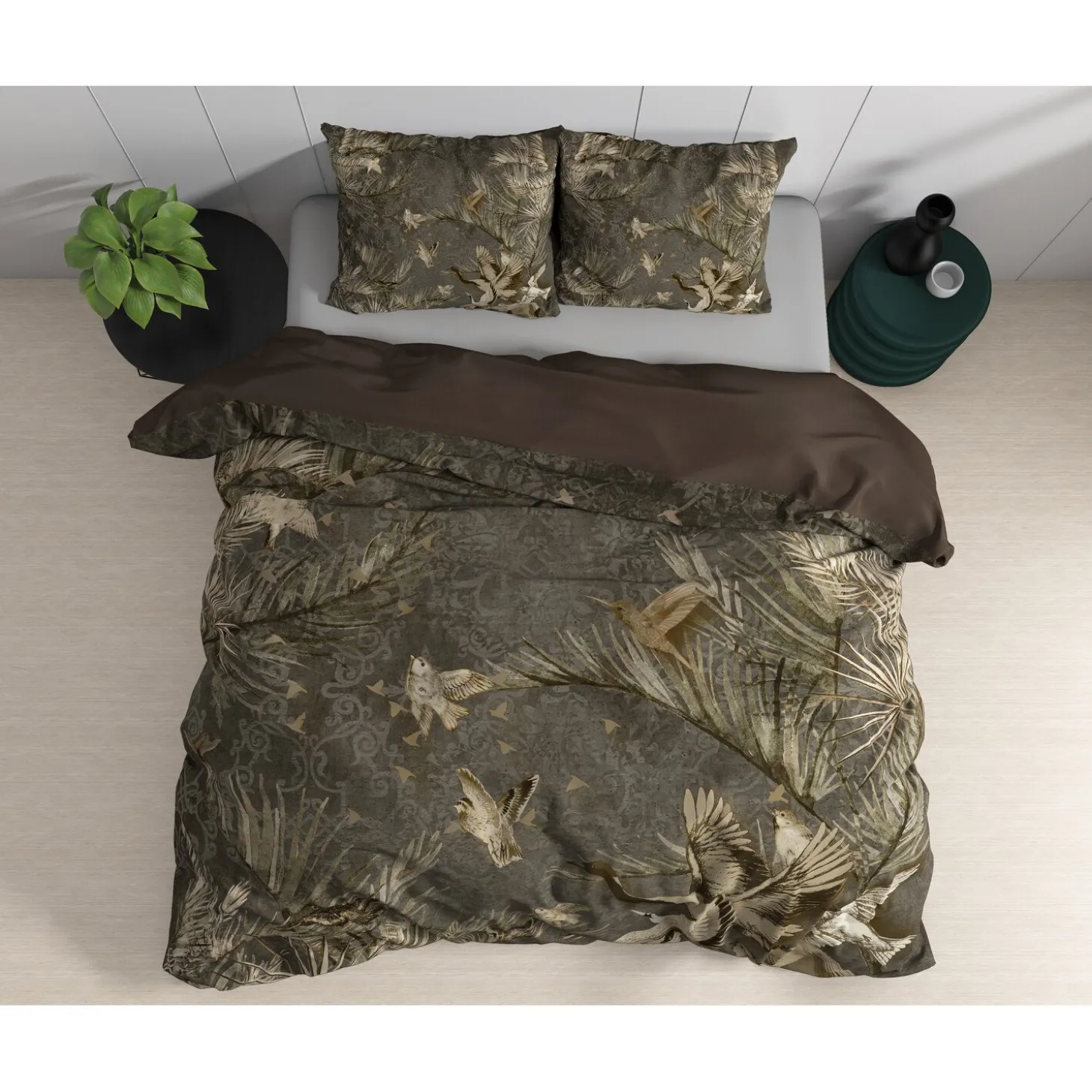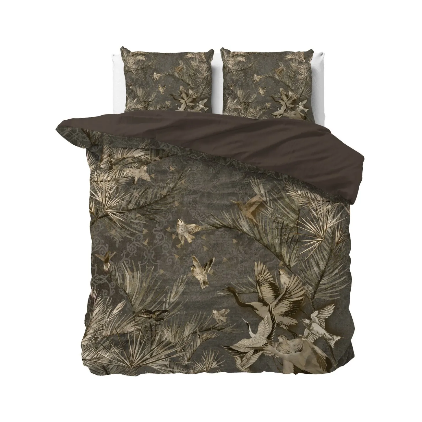 Dit luxueuze en comfortabele Dreamhouse Wild Aurelien-dekbedovertrek staat garant voor een overheerlijke nachtrust. Op het overtrek is een fantastische afbeelding van planten en vogels te zien. Wil je af en toe eens iets anders? Sla dan het beddengoed om en je ziet een taupe achterzijde tevoorschijn komen. Ook op de bijbehorende kussenslopen is de mooie print te zien. Dit dekbedovertrek heeft verder een totale lengte van 240 cm en is makkelijk af te sluiten met de handige drukknopen.