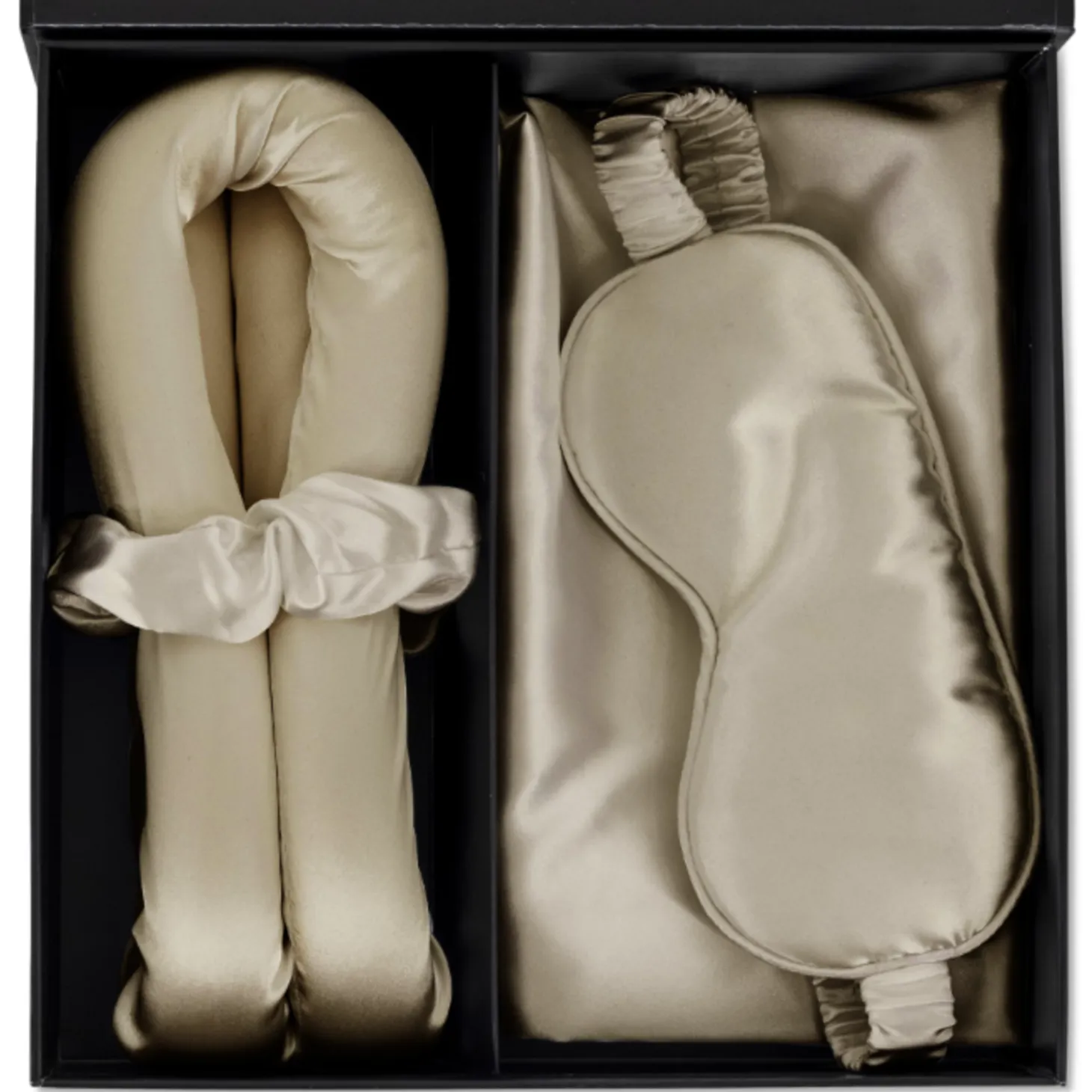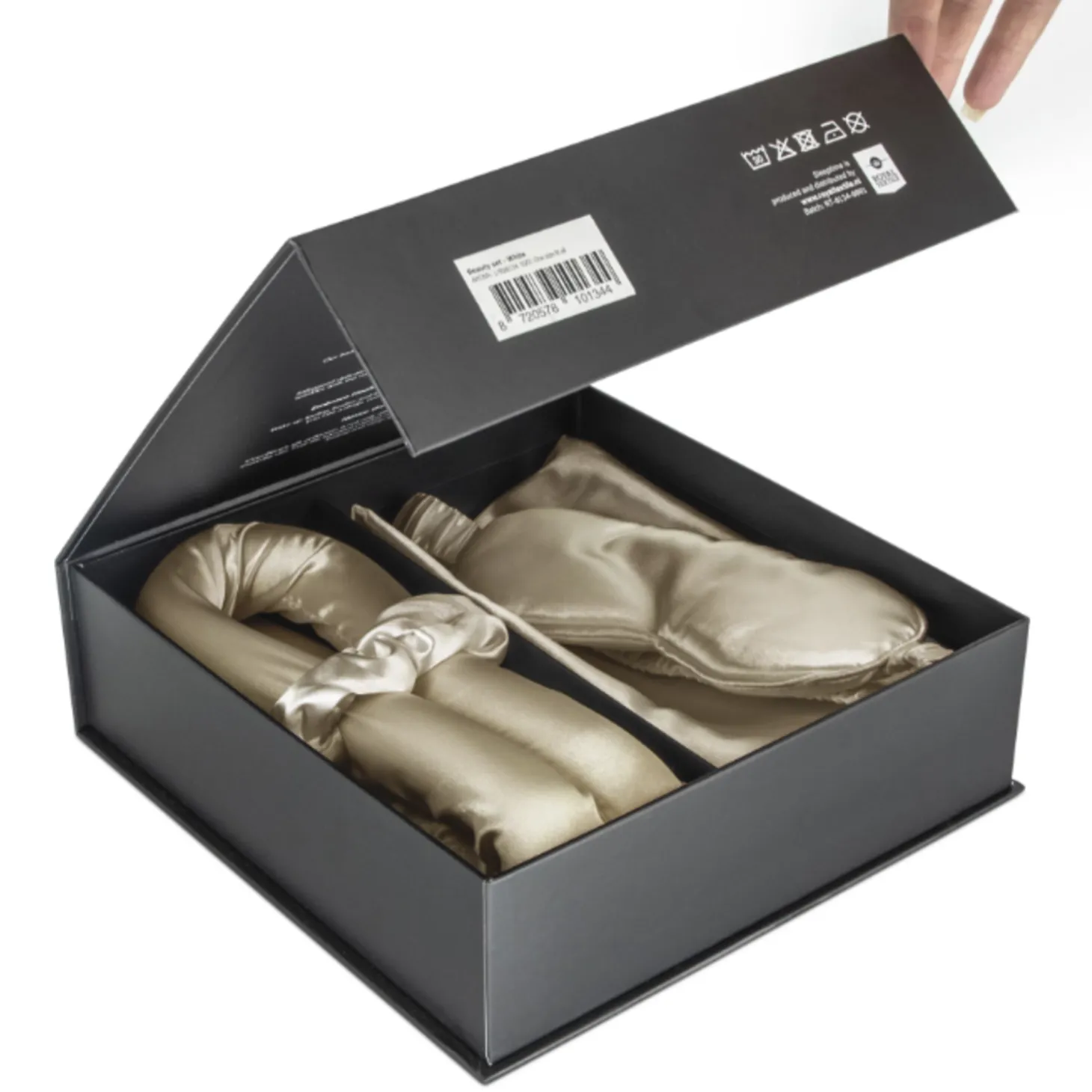 De Sleeptime Beauty Set bevat vier essentiële items die speciaal zijn ontworpen om je haar en huid te beschermen terwijl je slaapt. De satijnen kussensloop zorgt ervoor dat je haar ’s nachts niet pluist en voorkomt het ontstaan van slaaprimpels. Het satijnen oogmasker biedt een zachte, comfortabele pasvorm en helpt bij het verminderen van oogrimpels. De satijnen scrunchie houdt je haar op zijn plaats zonder het te beschadigen, ideaal voor elk haartype.