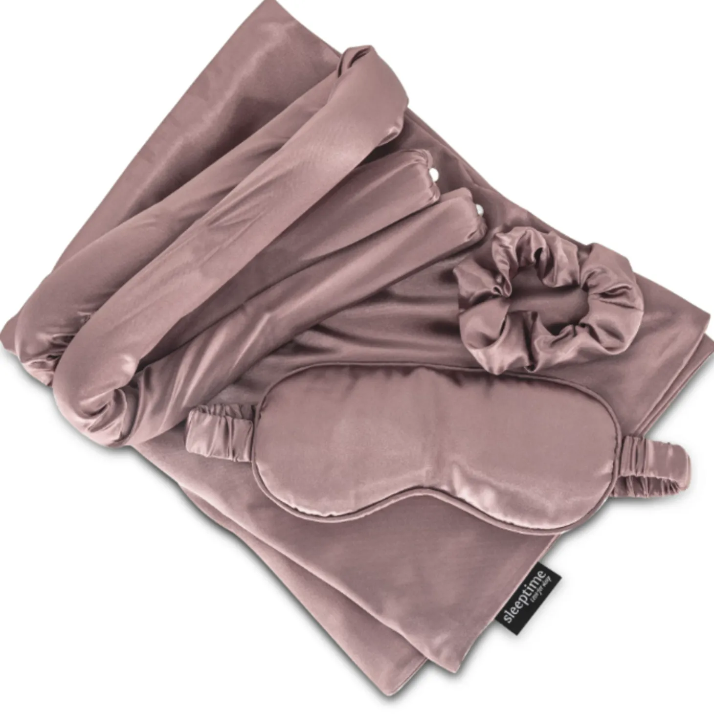 De Sleeptime Beauty Set bevat vier essentiële items die speciaal zijn ontworpen om je haar en huid te beschermen terwijl je slaapt. De satijnen kussensloop zorgt ervoor dat je haar ’s nachts niet pluist en voorkomt het ontstaan van slaaprimpels. Het satijnen oogmasker biedt een zachte, comfortabele pasvorm en helpt bij het verminderen van oogrimpels. De satijnen scrunchie houdt je haar op zijn plaats zonder het te beschadigen, ideaal voor elk haartype.
