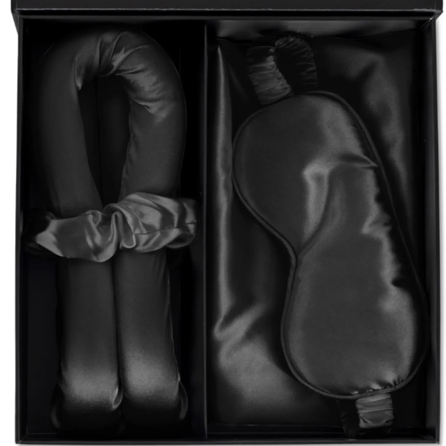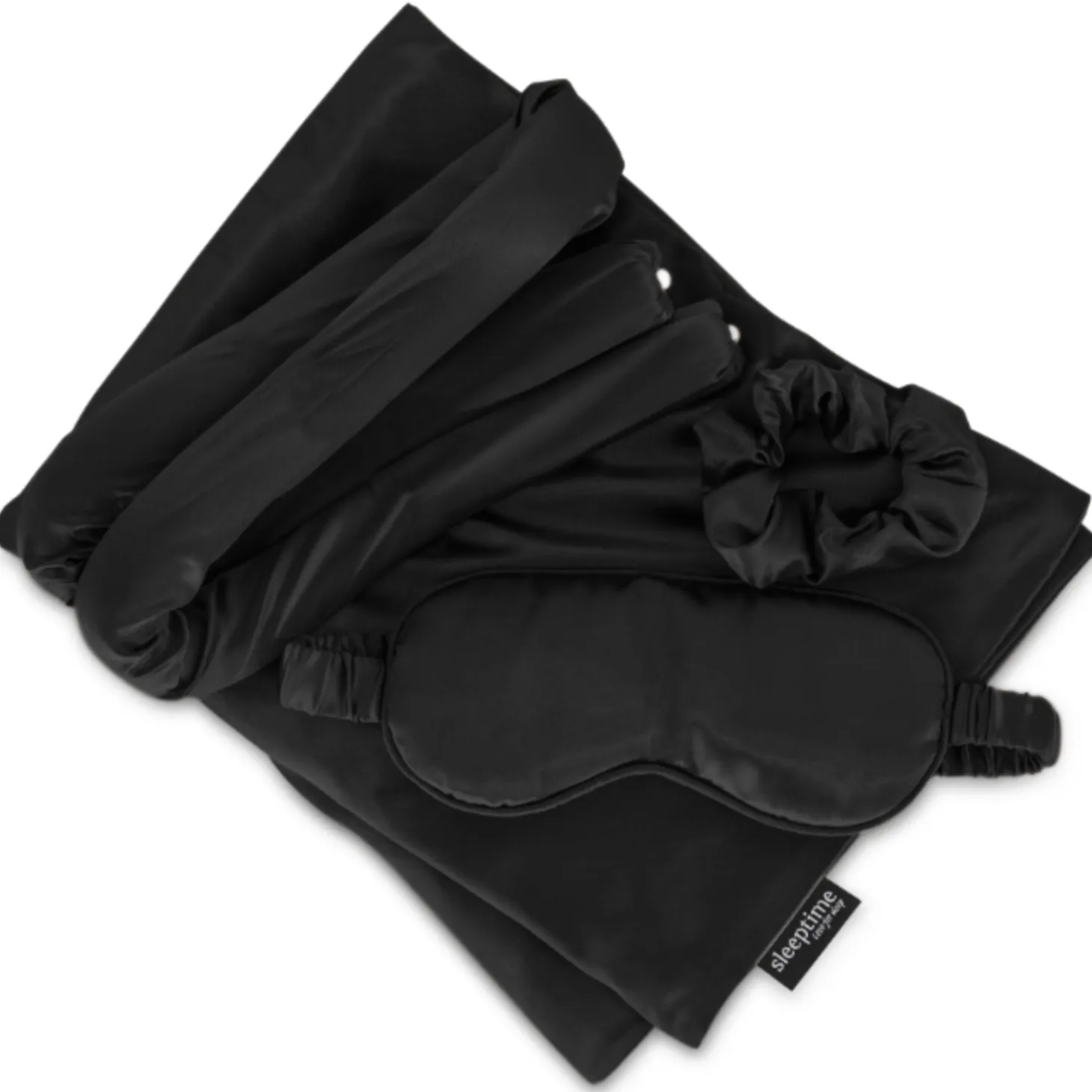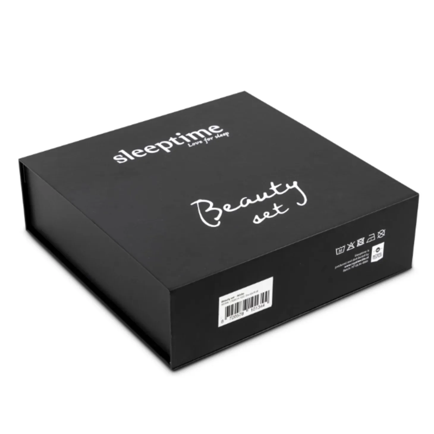 De Sleeptime Beauty Set bevat vier essentiële items die speciaal zijn ontworpen om je haar en huid te beschermen terwijl je slaapt. De satijnen kussensloop zorgt ervoor dat je haar ’s nachts niet pluist en voorkomt het ontstaan van slaaprimpels. Het satijnen oogmasker biedt een zachte, comfortabele pasvorm en helpt bij het verminderen van oogrimpels. De satijnen scrunchie houdt je haar op zijn plaats zonder het te beschadigen, ideaal voor elk haartype.