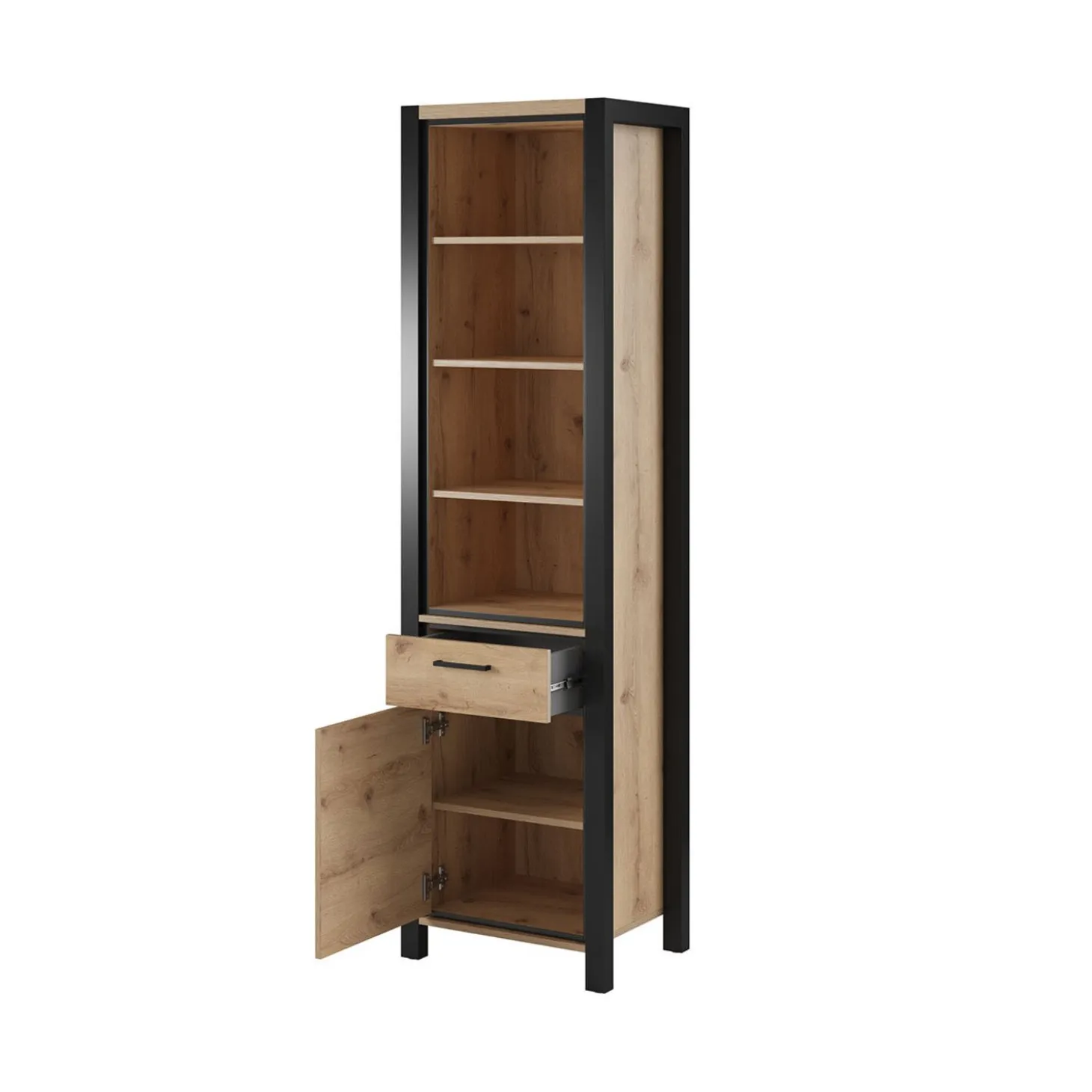 De boekenkast Akven heeft een strak en robuust ontwerp met een open indeling voor boeken en accessoires. De combinatie van houtlook en een stevig frame zorgt voor een moderne uitstraling, terwijl de vakken overzicht en praktische opbergruimte bieden.