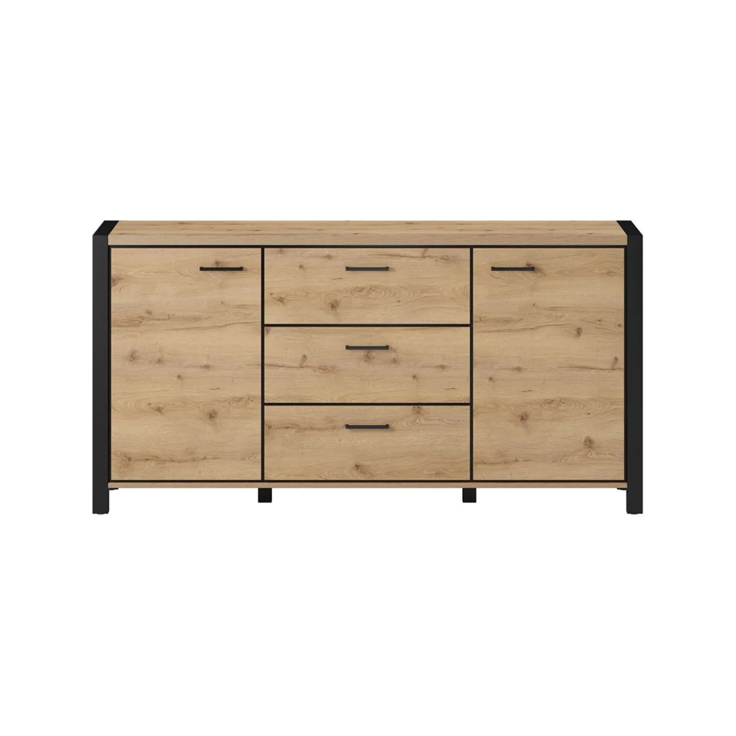 Het dressoir Akven heeft een strak en robuust ontwerp met een duidelijke combinatie van houtlook en een stevig frame. De indeling met deuren en lades biedt praktische opbergruimte, terwijl de strakke lijnen en contrasterende omlijsting zorgen voor een moderne en krachtige uitstraling.