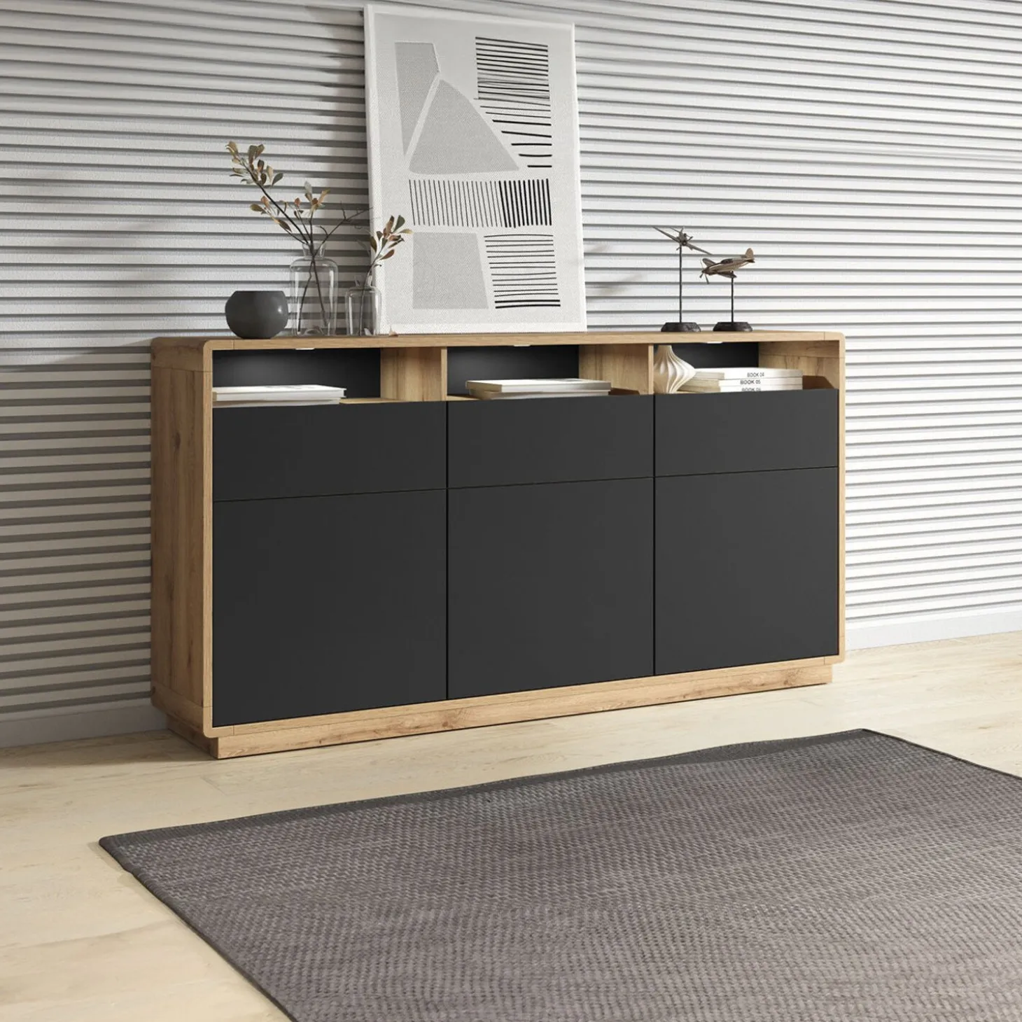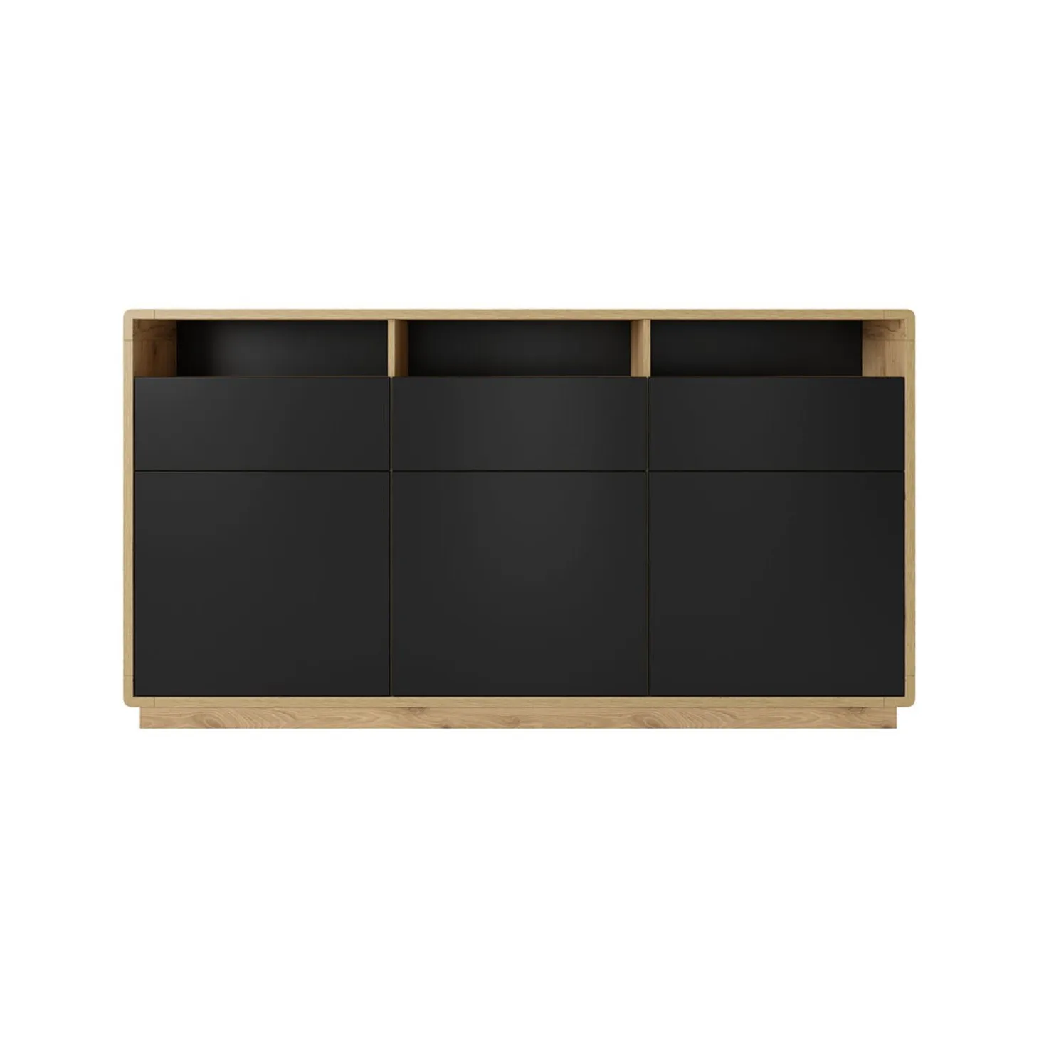Het dressoir Asmund heeft een strak en modern ontwerp met een rustige uitstraling en een subtiele open vakverdeling aan de bovenzijde. De combinatie van gesloten fronten en open ruimtes zorgt voor een praktisch en overzichtelijk geheel.