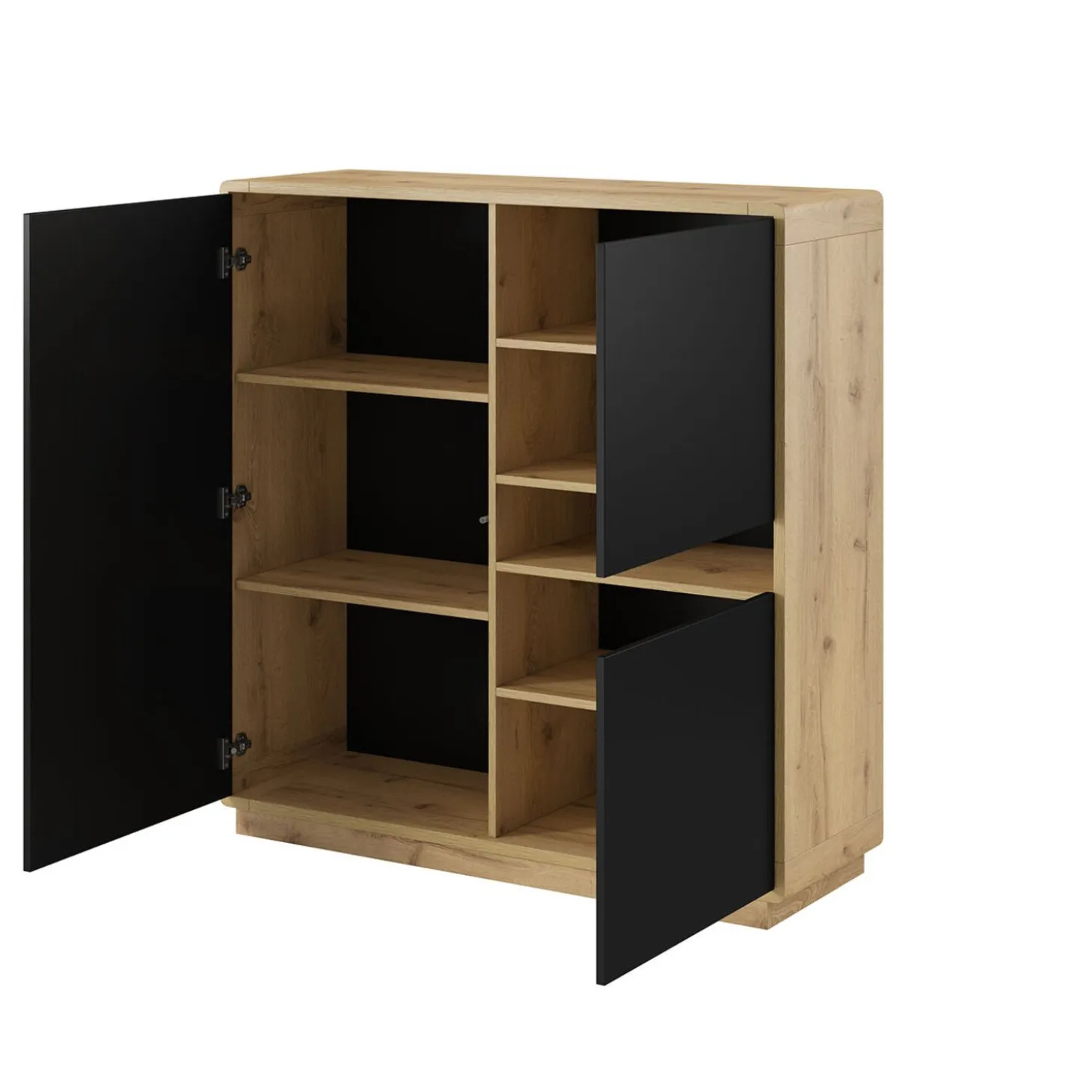 Het dressoir Asmund heeft een strak en compact ontwerp met een rustige, symmetrische indeling. De gesloten fronten worden doorbroken door een open vak, wat zorgt voor een subtiel en modern accent.