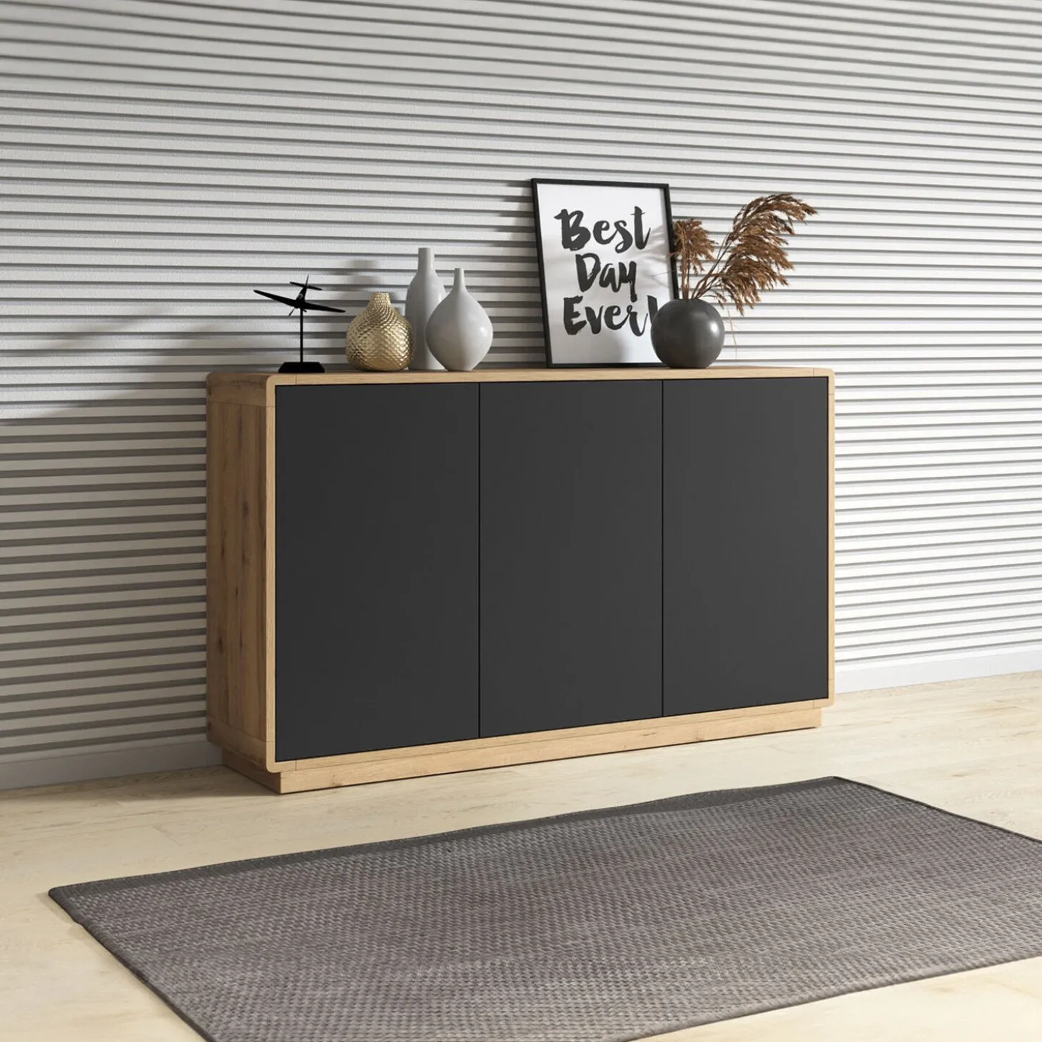 Het dressoir Asmund heeft een strak en modern ontwerp met een rustige, gesloten voorzijde. De brede opzet en rechte lijnen zorgen voor een minimalistische uitstraling, terwijl de kast voldoende opbergruimte biedt voor een opgeruimd interieur.