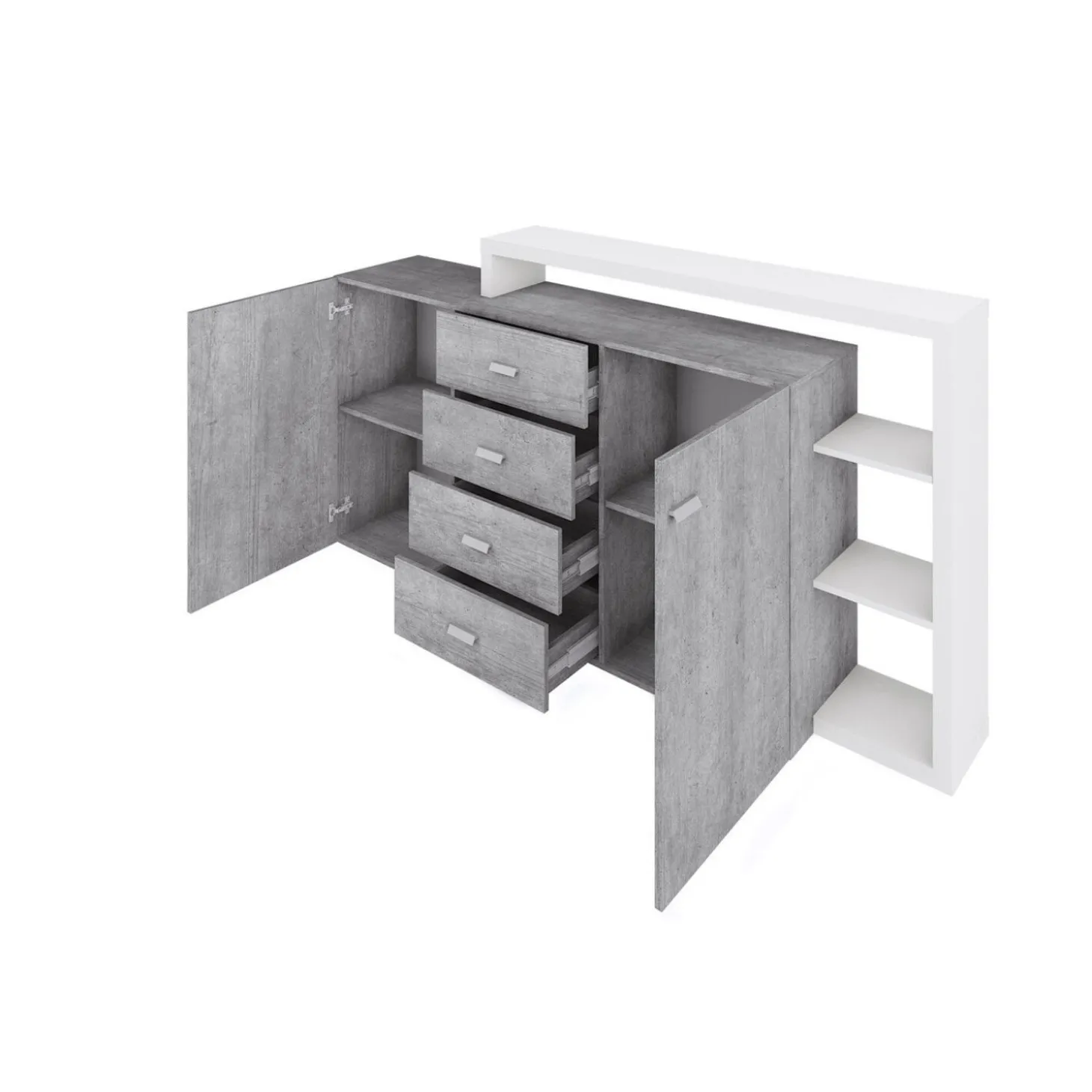 Het dressoir Bologna heeft een rustige en moderne uitstraling met een strakke indeling van deuren, lades en open vakken. De combinatie van gesloten opbergruimte en een open bovendeel zorgt voor een praktisch en luchtig geheel in de ruimte.