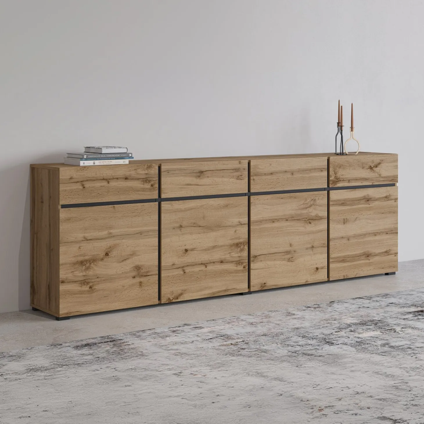 Het dressoir Crotone heeft een strak en modern ontwerp met een greeploos front en een rustige, symmetrische indeling. De brede opzet met meerdere vakken biedt veel opbergruimte, terwijl het minimalistische design zorgt voor een nette en eigentijdse uitstraling.