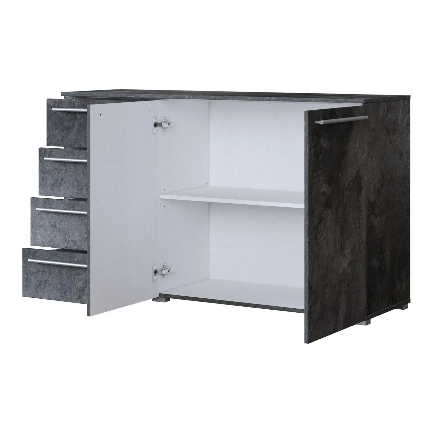 Het dressoir is voorzien van vier ruime lades en twee deuren met daarachter een legplank. Zo kun je eenvoudig kleding, beddengoed, servies of andere accessoires overzichtelijk en stofvrij opbergen. De strakke lijnen, glanzende afwerking en stijlvolle metalen grepen geven het meubel een elegante en moderne look.
