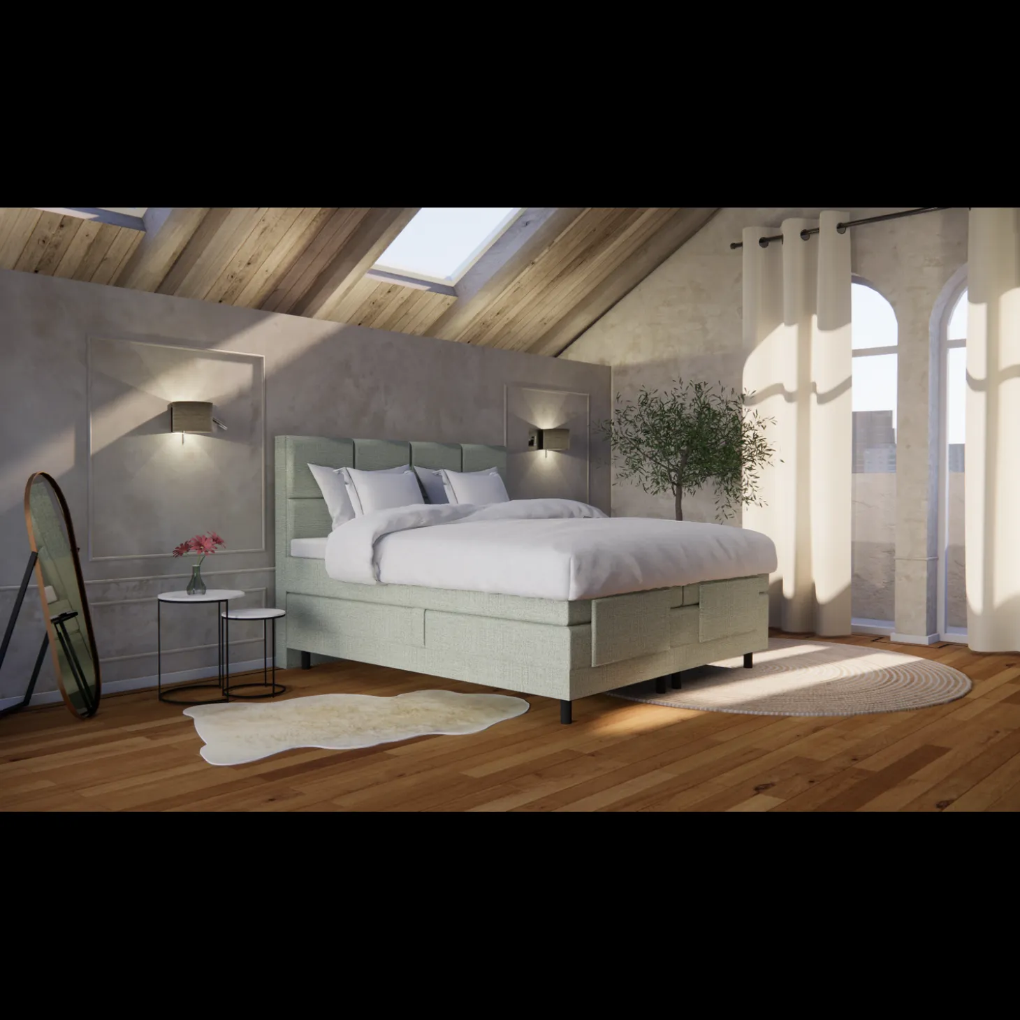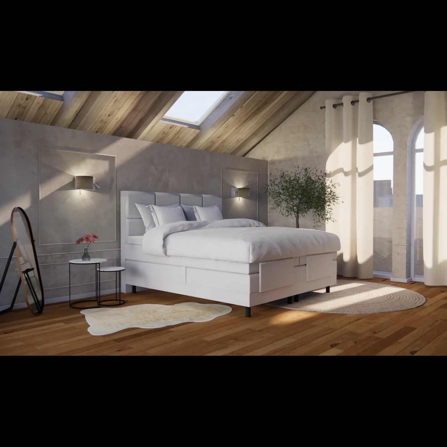 Motor & Frame: De elektrische boxspring wordt geleverd met krachtige 6000 newton motoren. Het half-frame is volledig weggewerkt in een houten omranding dat gestoffeerd is in dezelfde luxe meubelstof als de boxspring.