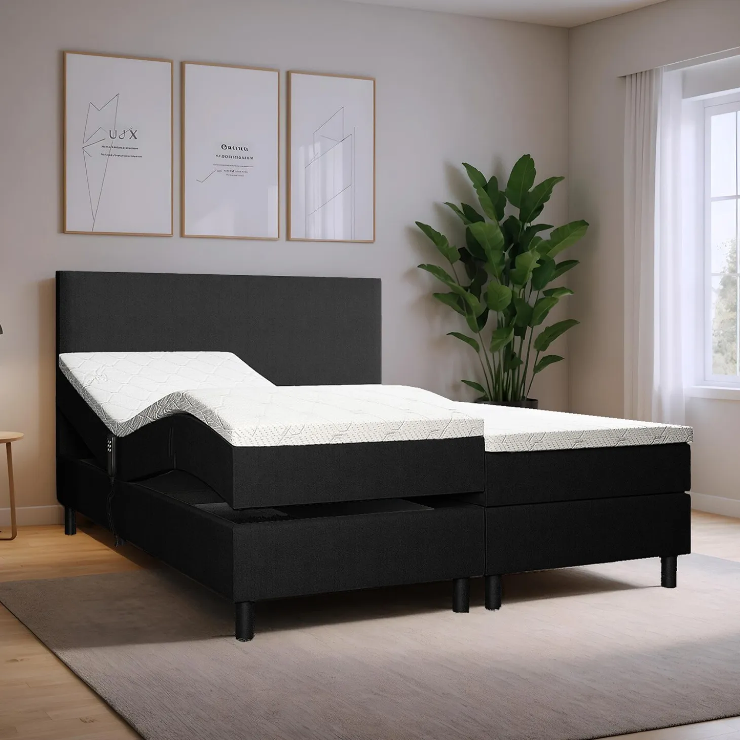 De boxspring is voorzien van een onderring met geïntegreerd elektrisch frame (20 cm dik) en wordt geleverd met 4 poten per box. De motoren (6000 Newton) zijn krachtig en stil, volledig weggewerkt in een gestoffeerd houten frame voor een strakke afwerking.