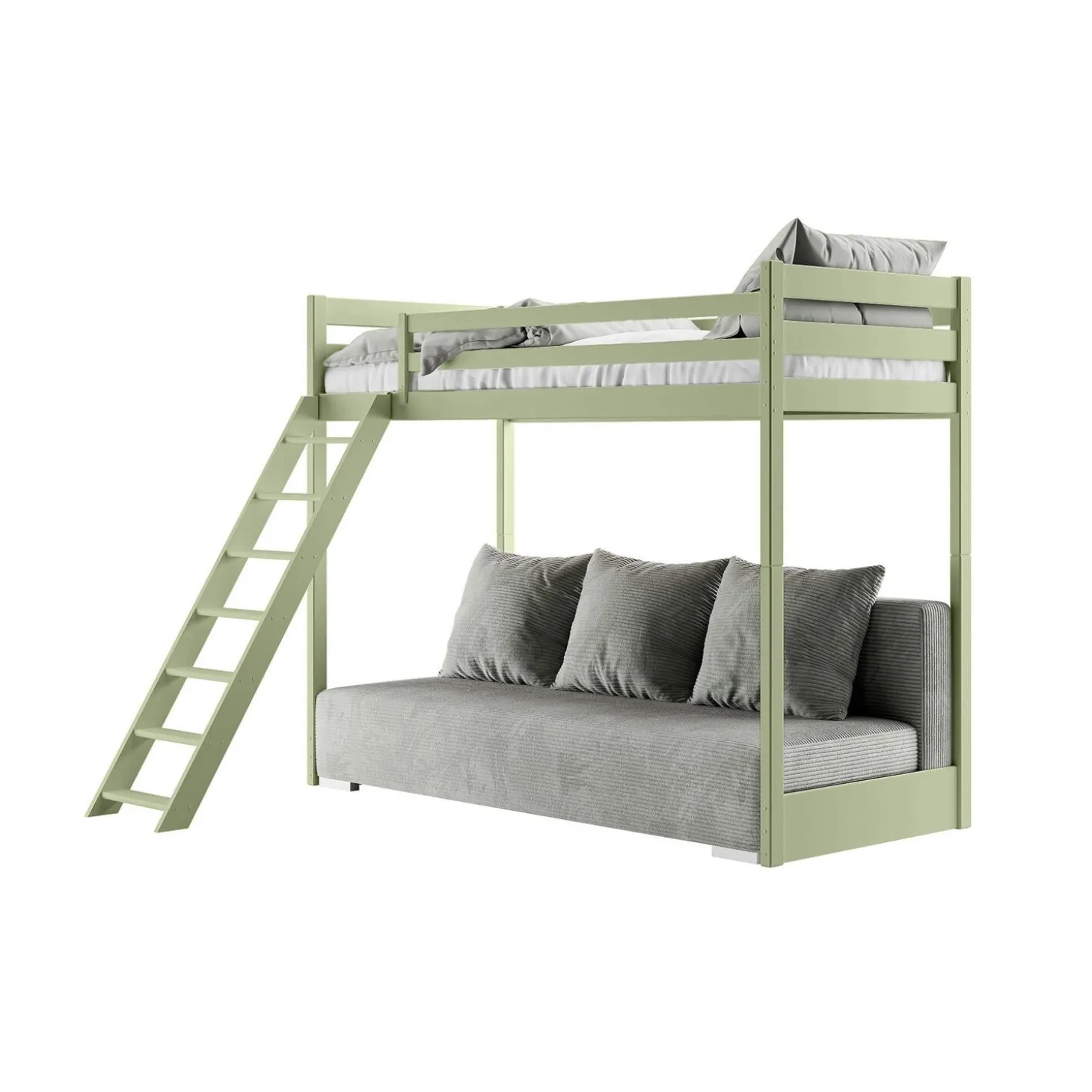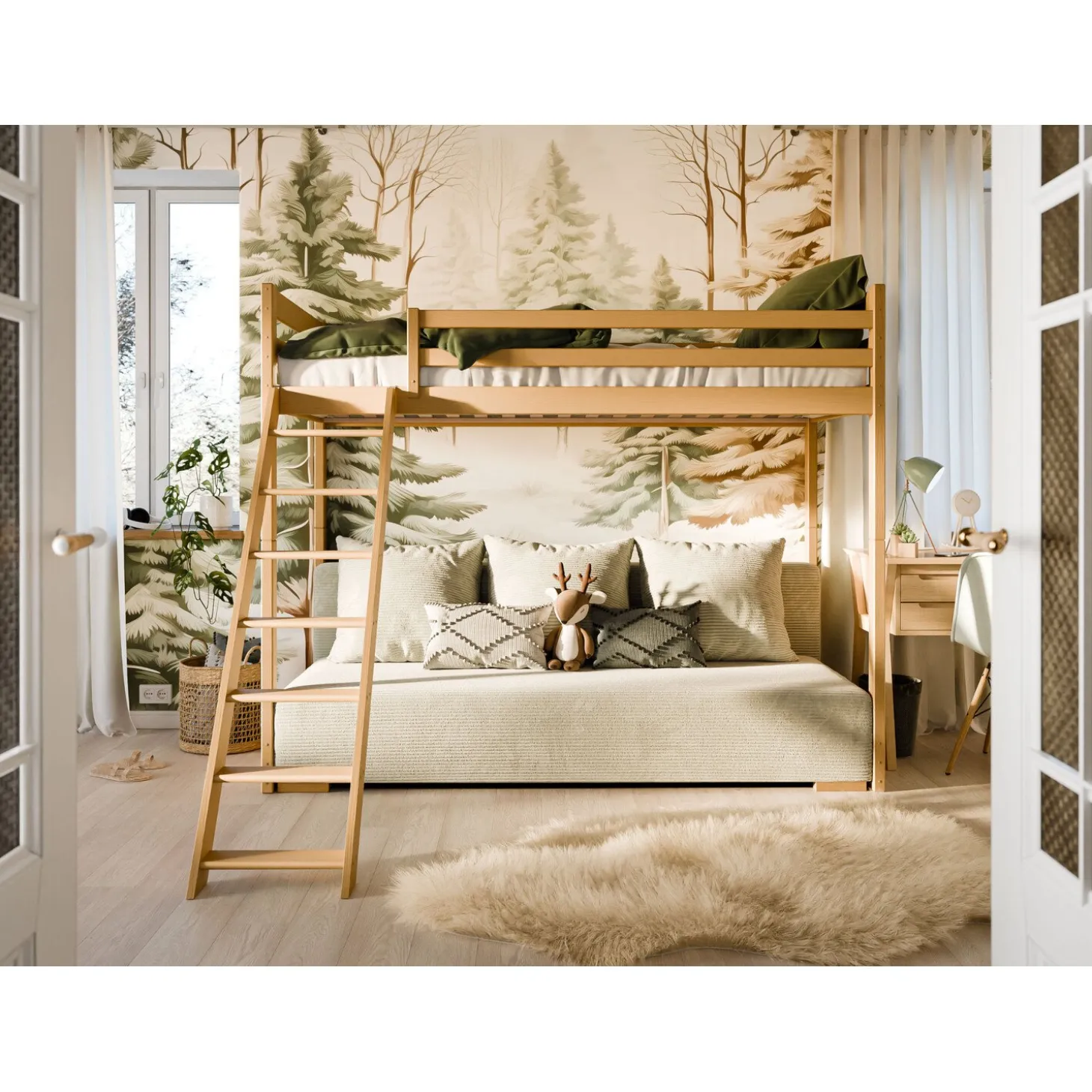 Bovenin lekker slapen, onderin fijn zitten. Met de stevige ladder klim je veilig naar het bovenbed. De bedbank eronder gebruik je overdag om te zitten en ’s avonds om te slapen. Perfect voor kinderen of tieners met logees of een praktische kamer.