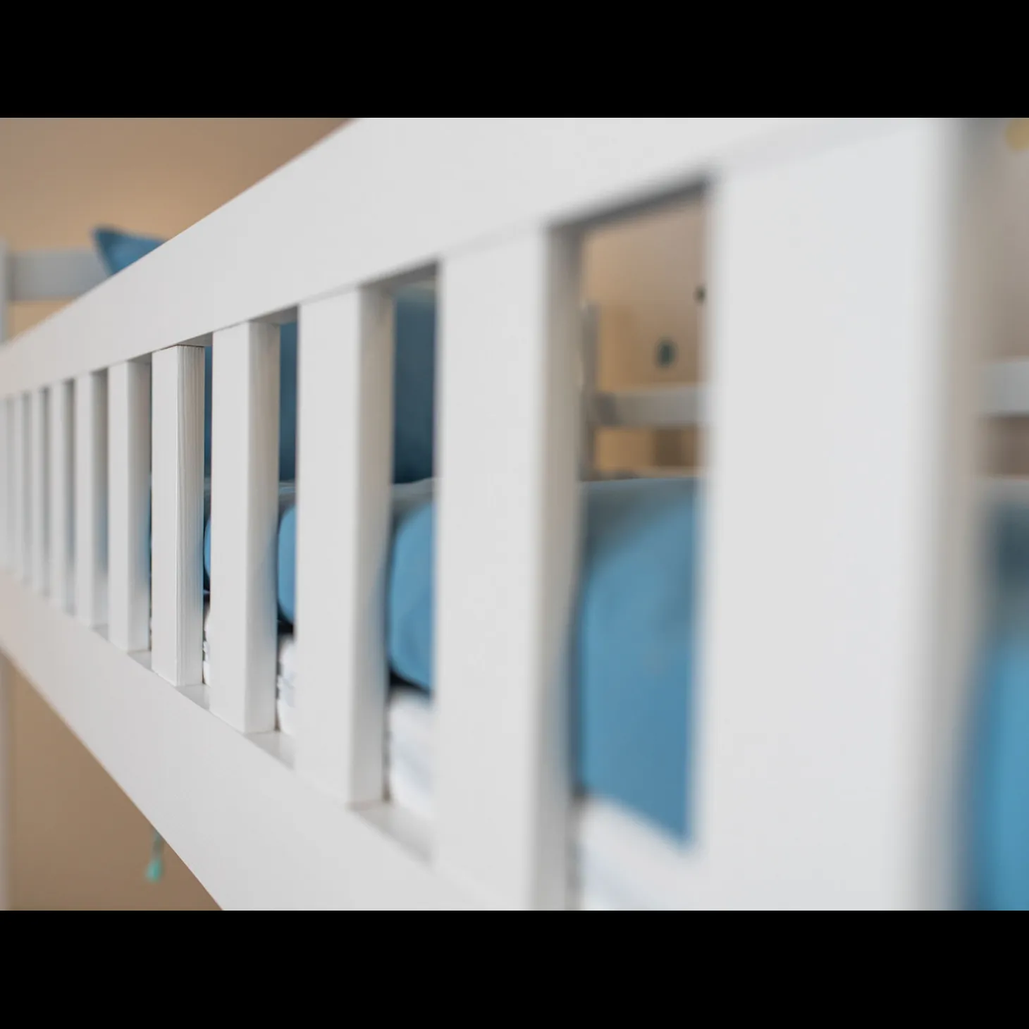 Gemaakt van een stevige basis, verhoogde zijpanelen bij het bovenbed en een kindvriendelijk ontwerp voor een veilige en comfortabele slaapomgeving. Het straalt rust en een gevoel van veiligheid uit, zodat je kind lekker kan slapen.