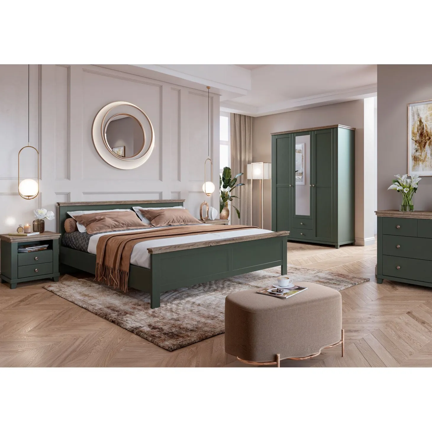 Het Houten Bed Elvas is een elegant bedframe met een klassieke en landelijke uitstraling. De warme donkergroene kleur van eiken in combinatie met het verfijnde ontwerp geeft dit bed een rustgevende en stijlvolle uitstraling. Het bedframe maakt deel uit van de Elvas-collectie: een moderne slaapkamerlijn waarin functionaliteit en verfijnde vormgeving perfect samenkomen. Het bed wordt geleverd zonder matras en zonder lattenbodem.