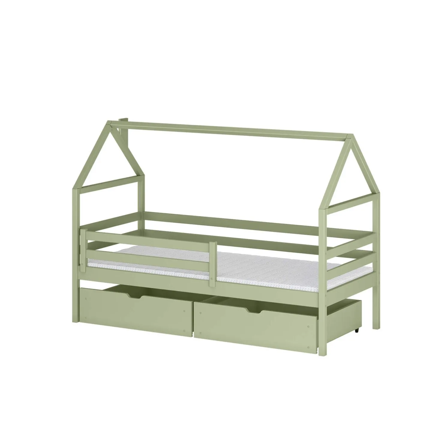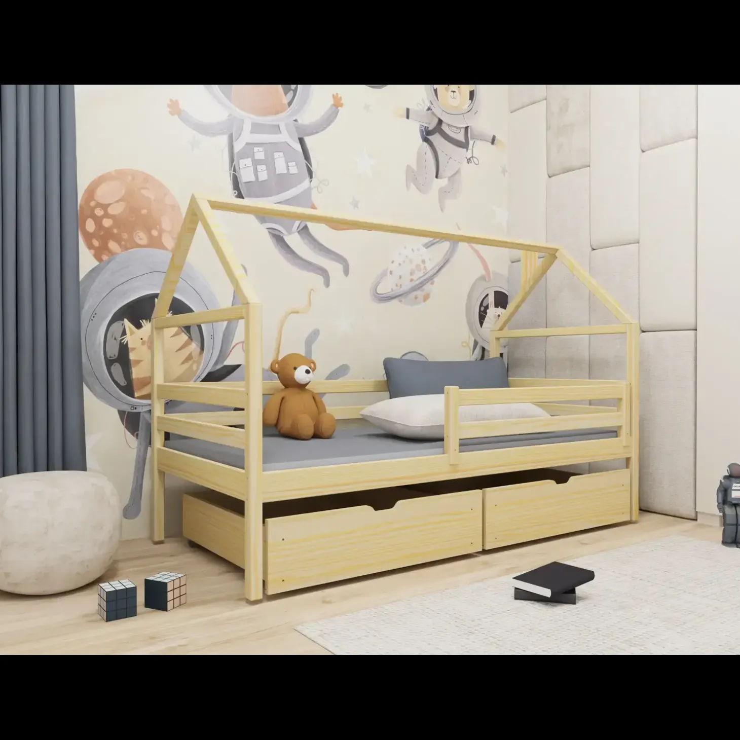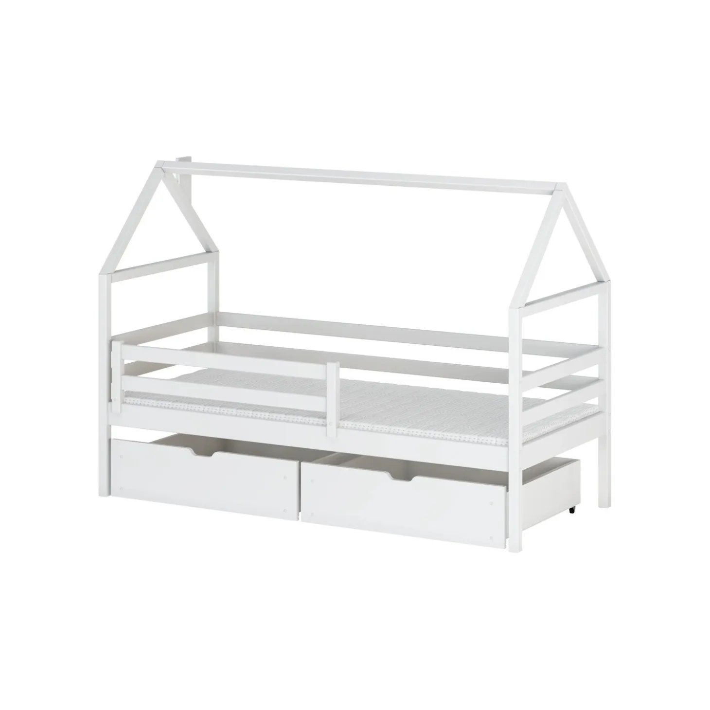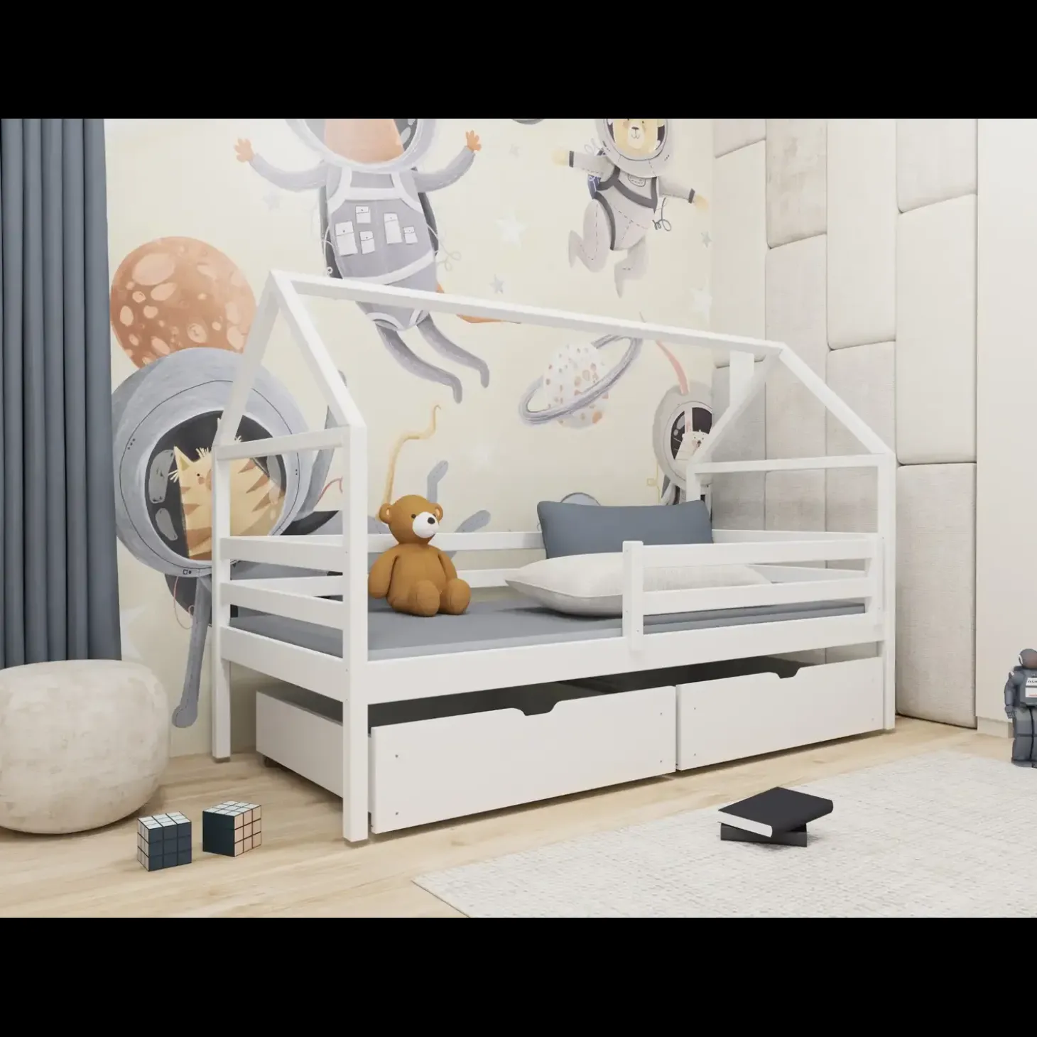 Het Huisbed Aaron is een droom voor elk kind. Het stevige frame is perfect om een stoffen hemel, klamboe of lichtsnoer aan te hangen, waardoor je een knusse en gezellige sfeer creëert. Dit bed combineert fantasierijk slapen met praktisch gemak dankzij de twee ruime lades onder het bed, ideaal voor speelgoed, dekentjes of andere spullen. Een veilige, sfeervolle en opgeruimde kinderkamer in één.