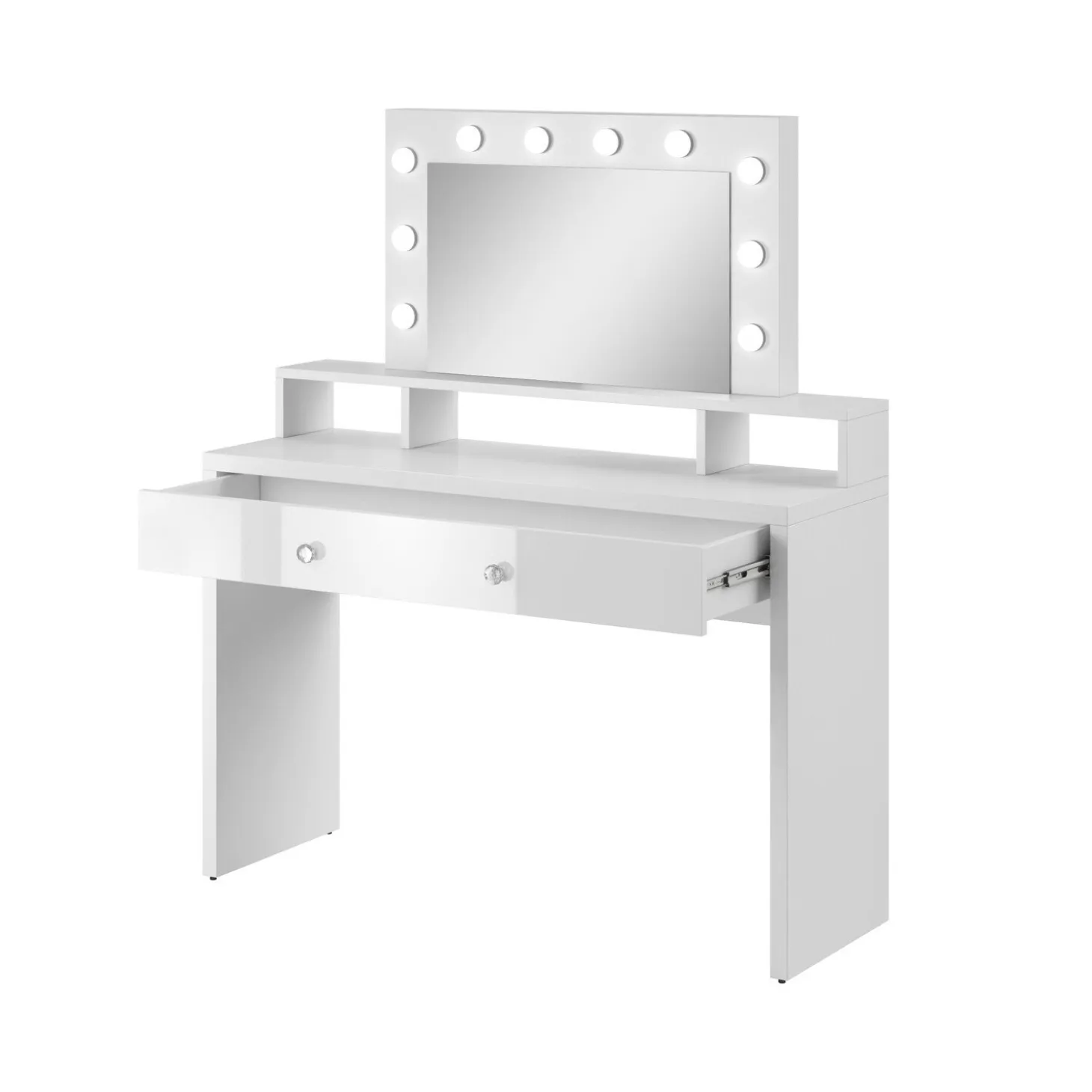 Het royale spiegelpaneel is omringd door stijlvolle LED-verlichting, zodat je altijd beschikt over perfect licht voor je dagelijkse beauty- en verzorgingsroutine. De handige open vakken bieden ruimte voor make-up, parfum of accessoires die je graag binnen handbereik hebt. Daarnaast beschikt de kaptafel over een ruime lade met sierlijke knoppen, ideaal voor het netjes opbergen van al je beauty essentials.