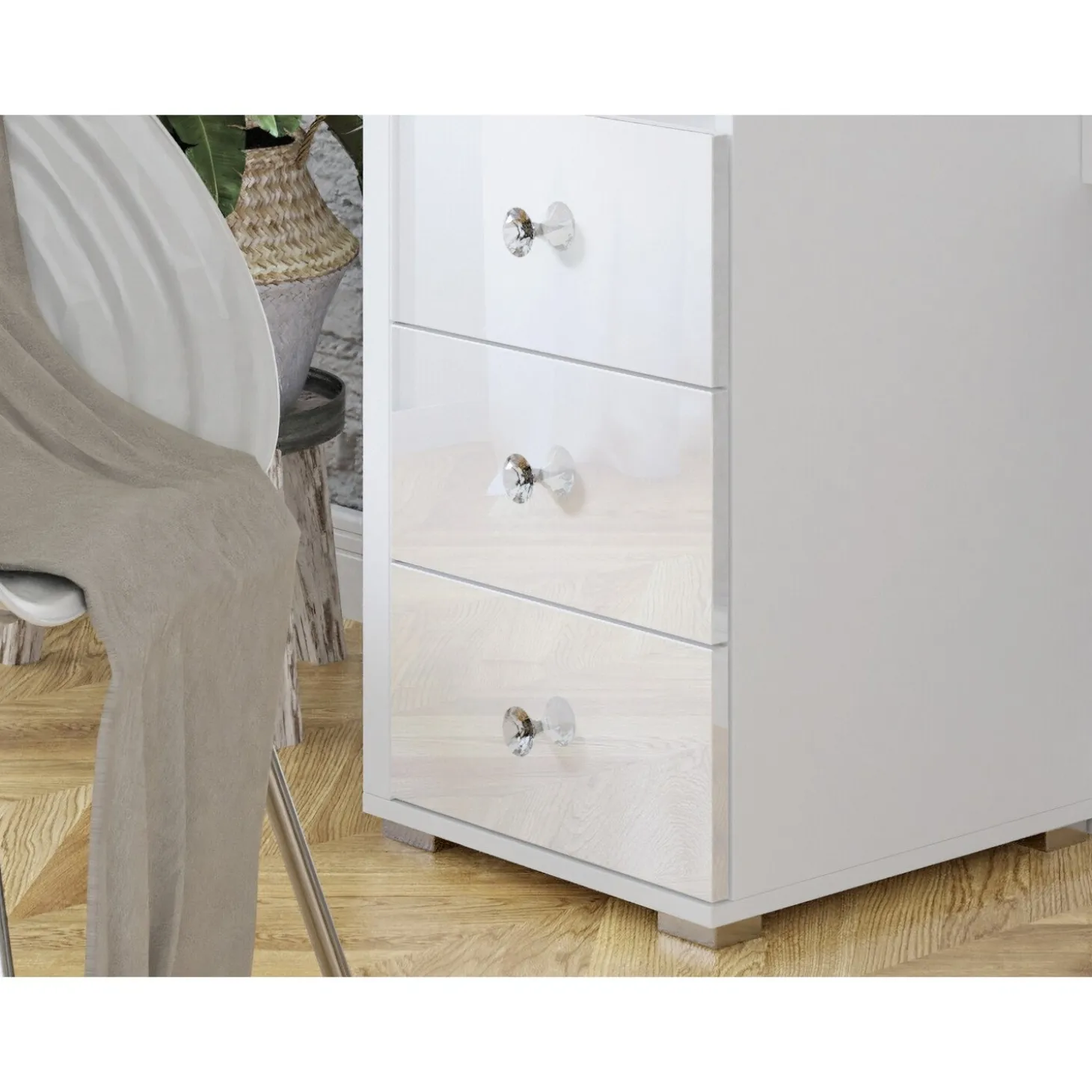Naast de open vakken biedt de kaptafel extra veel opbergruimte dankzij drie praktische lades en een ruime lade onder het tafelblad. Ideaal om make-up, sieraden en beautyproducten overzichtelijk en stofvrij op te bergen. De elegante, kristalachtige knoppen geven de lades een verfijnde finishing touch.