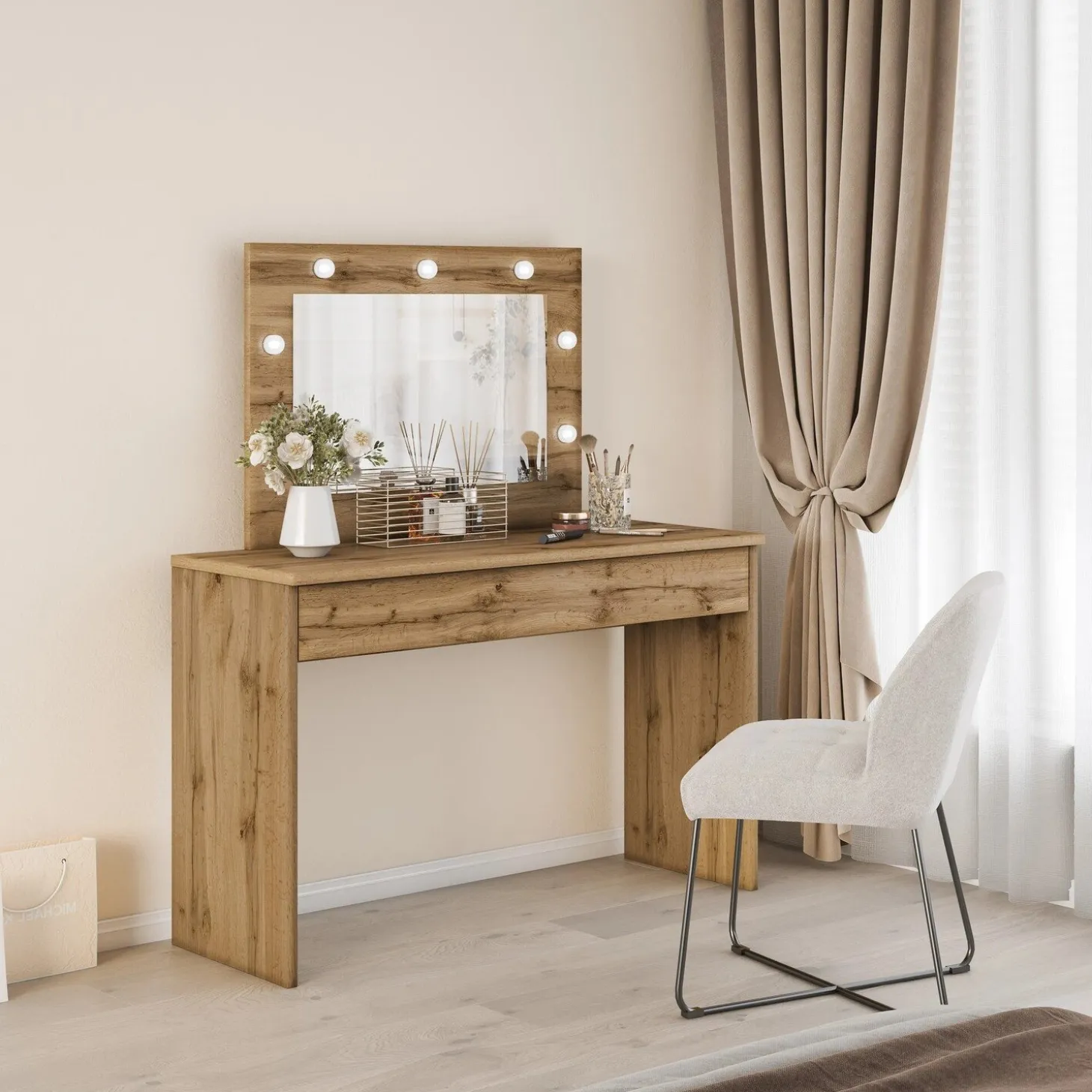 Het grote spiegelpaneel is voorzien van stijlvolle ingebouwde verlichting, zodat je altijd het perfecte licht hebt om je make-up aan te brengen of je haar te stylen. Dankzij de brede lade heb je voldoende ruimte om al je beautyproducten, sieraden en accessoires netjes op te bergen.