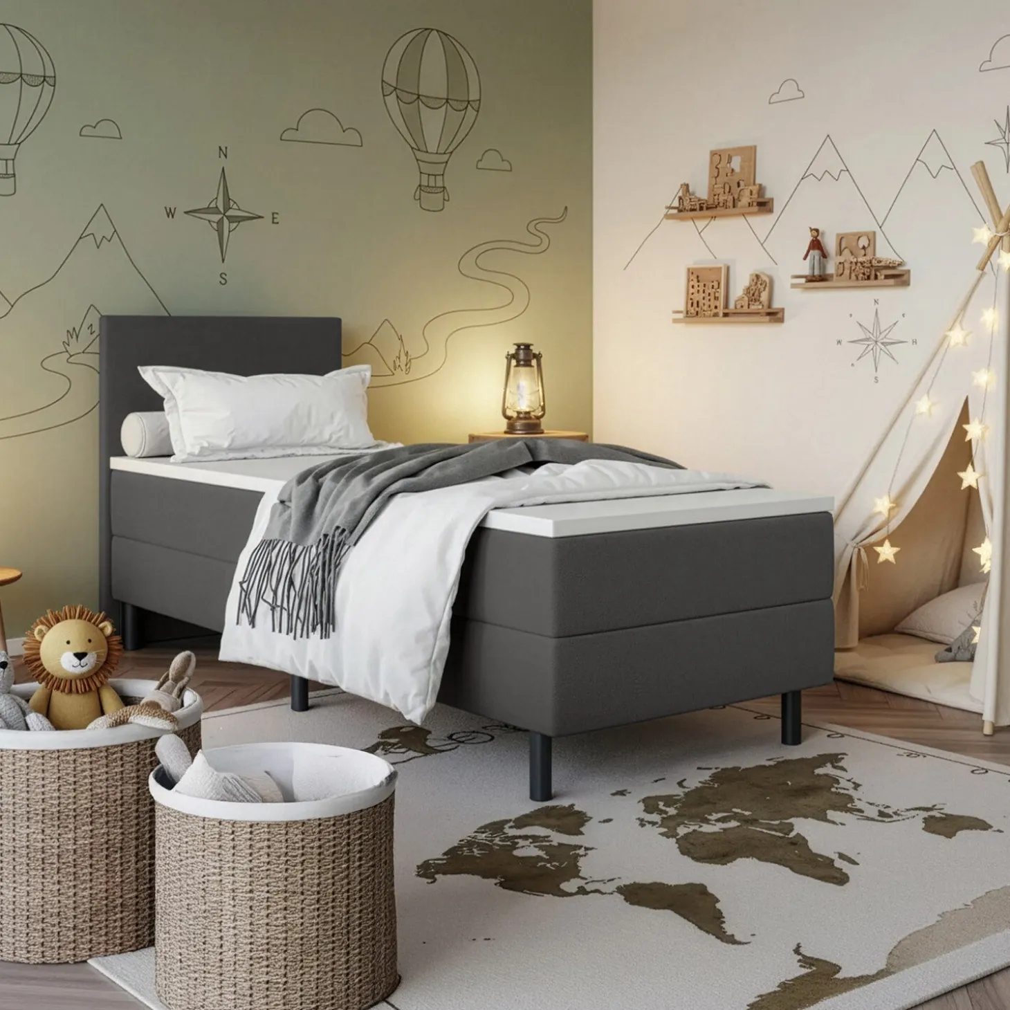 De vlakke boxen van Kinderboxspring Liv zijn opgebouwd uit een stevige houten constructie en afgewerkt met een duurzame, geweven meubelstof. Elke box staat op zes poten, wat zorgt voor goede stabiliteit en betrouwbare ondersteuning bij dagelijks gebruik in de kinder of tienerkamer.