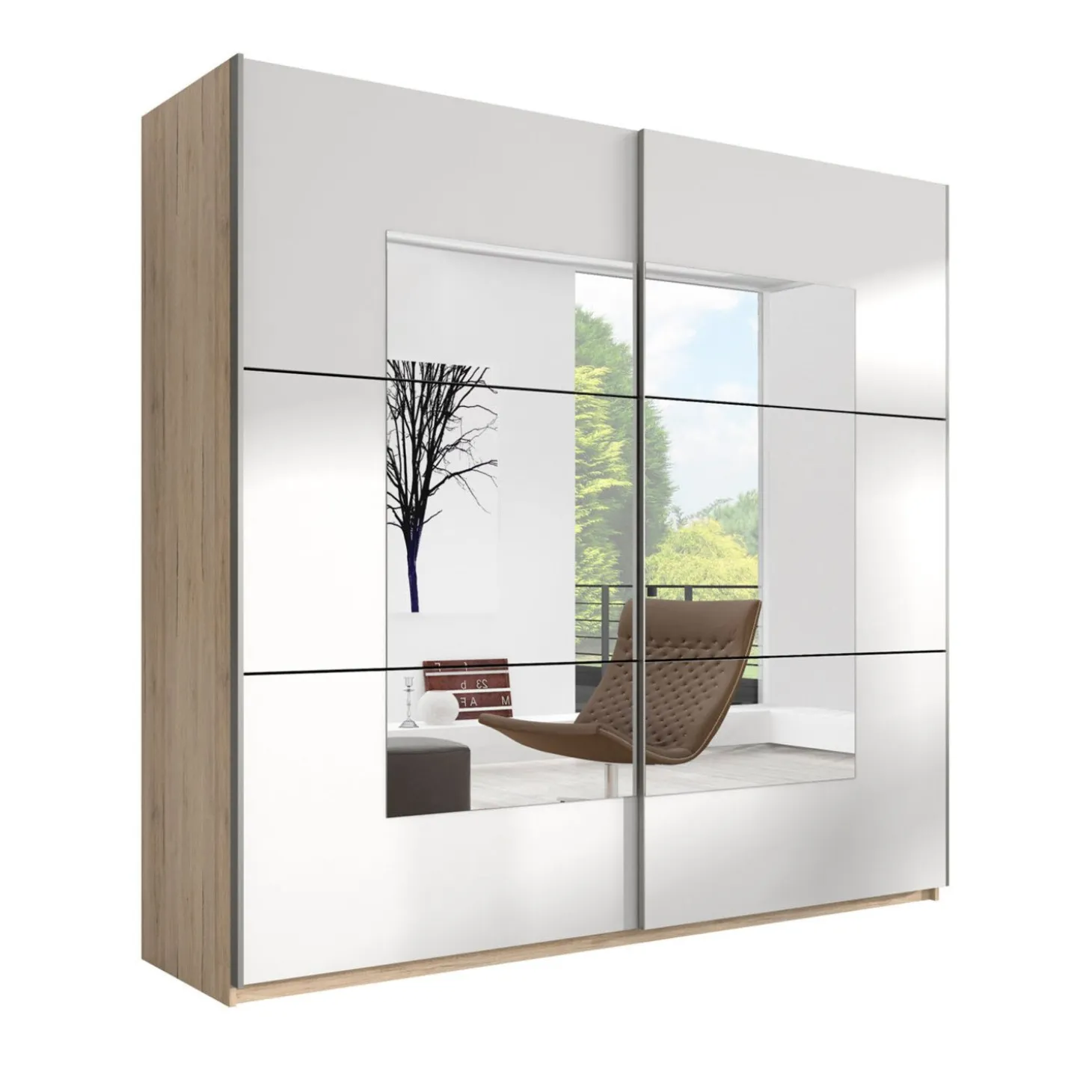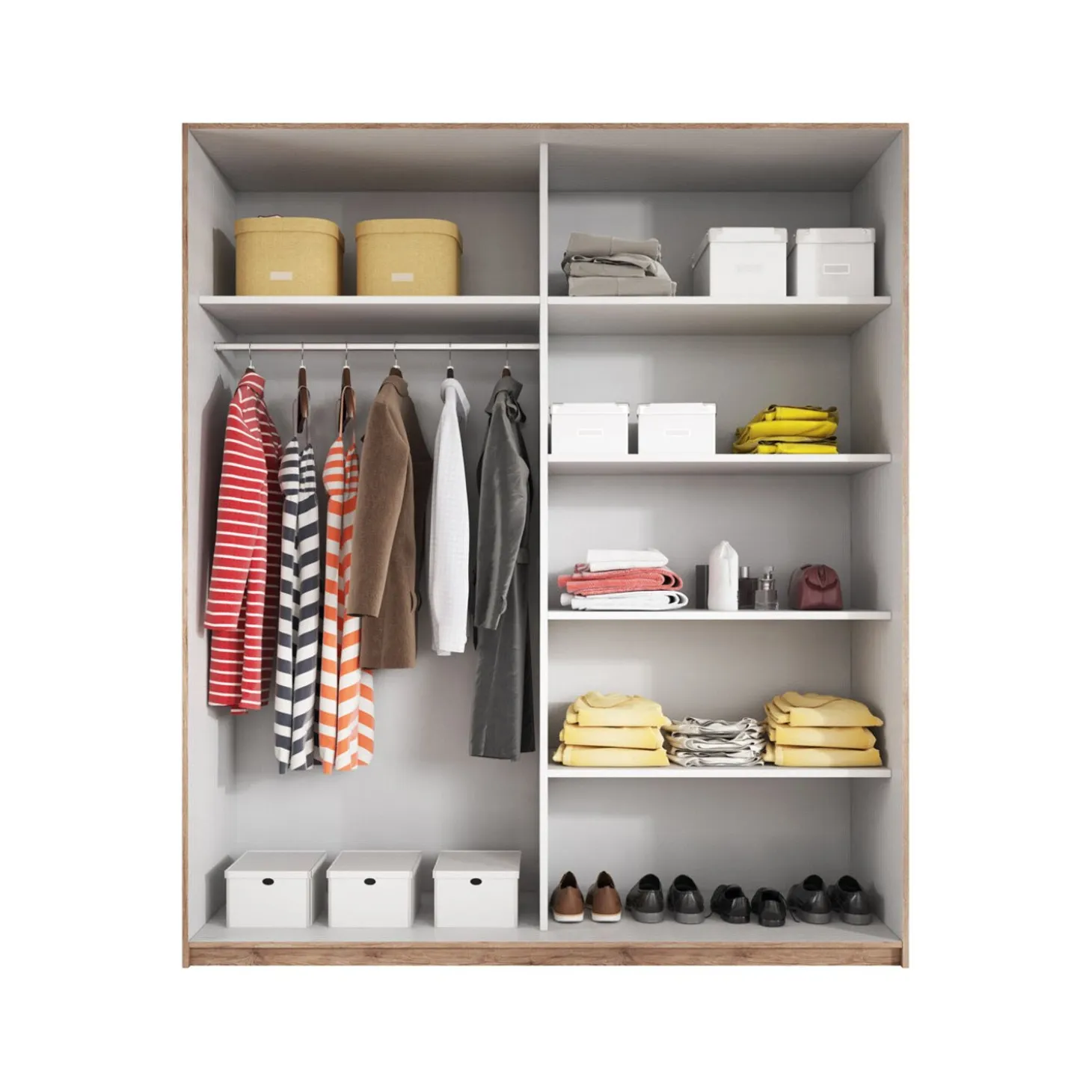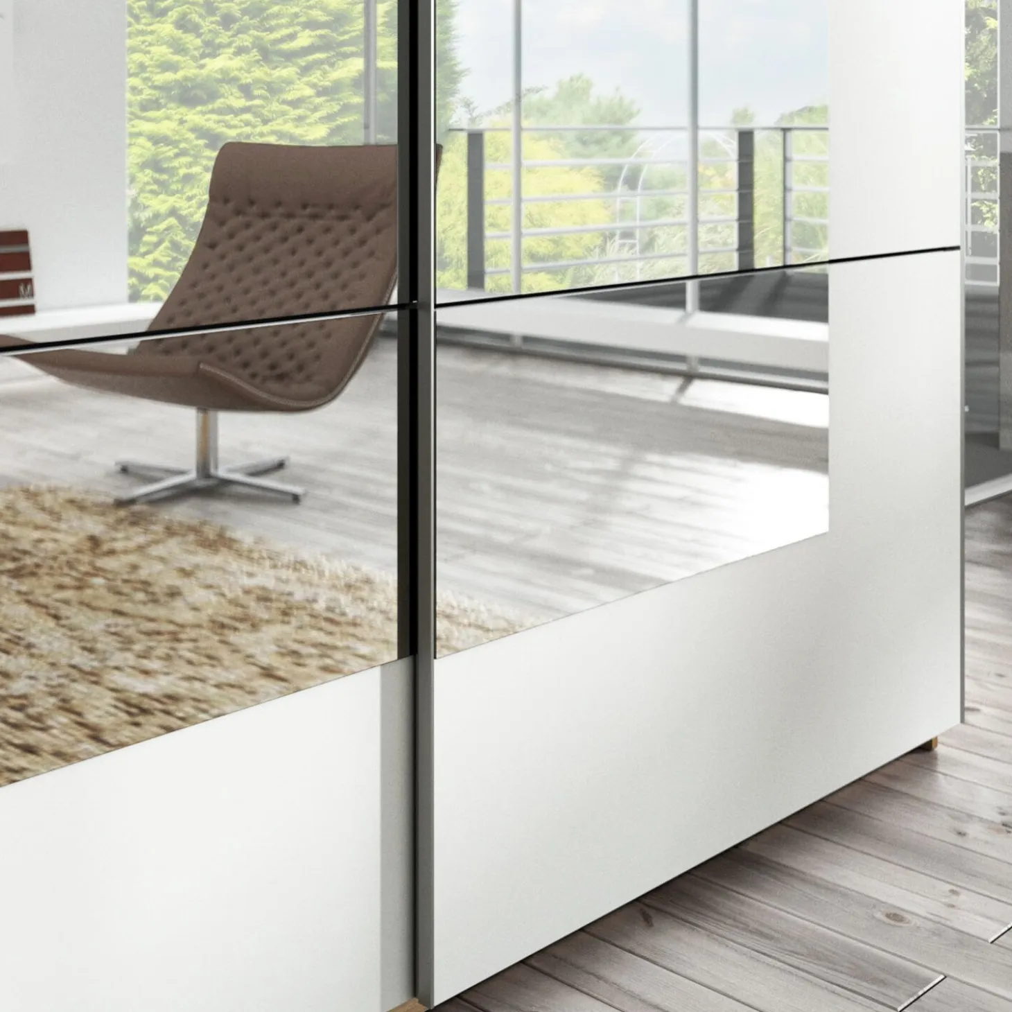 De kledingkast Bern heeft een strak en modern ontwerp met grote, vlakke deuren en een symmetrische vlakverdeling. De geïntegreerde spiegelvlakken zorgen voor een ruimtelijk effect en geven de kast een lichte en moderne uitstraling.
