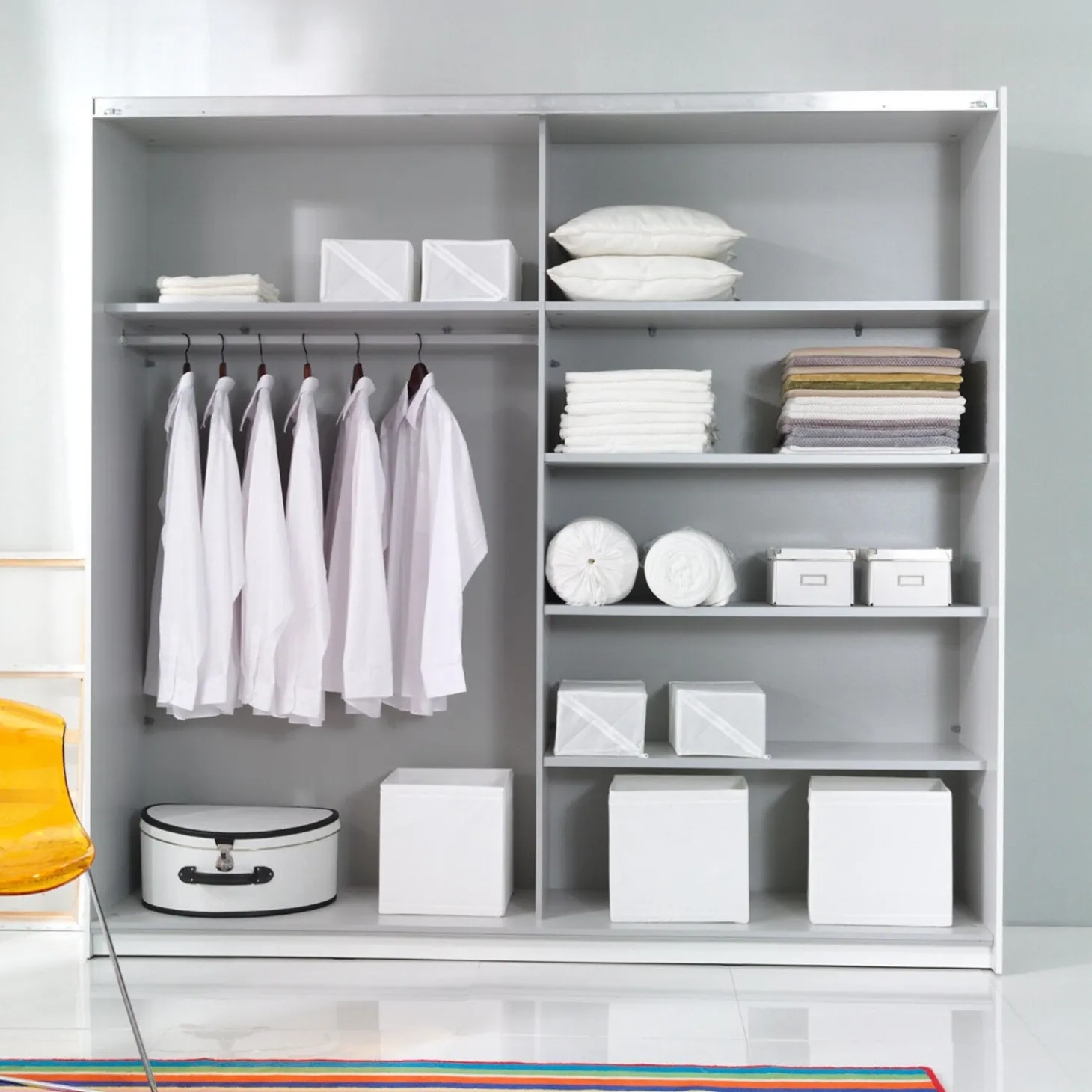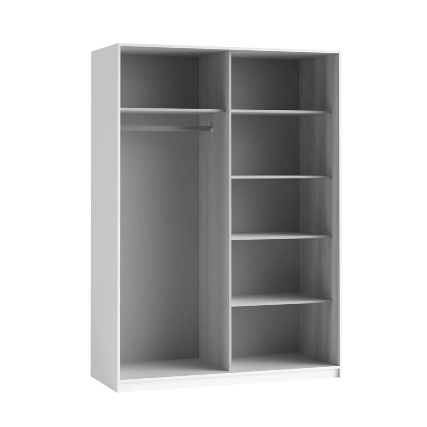 De kledingkast Bern heeft een strak en modern ontwerp met grote, vlakke deuren en een symmetrische vlakverdeling. De geïntegreerde spiegelvlakken zorgen voor een ruimtelijk effect en geven de kast een lichte en moderne uitstraling.