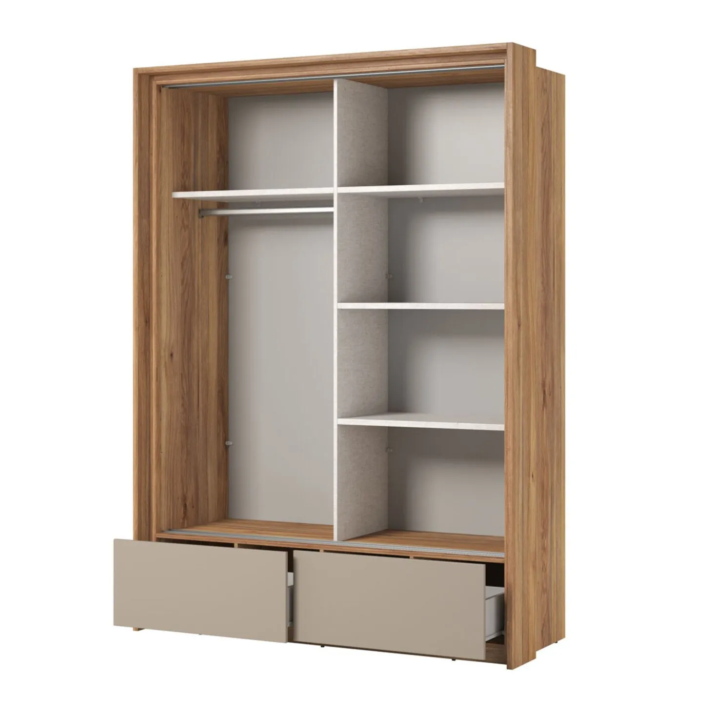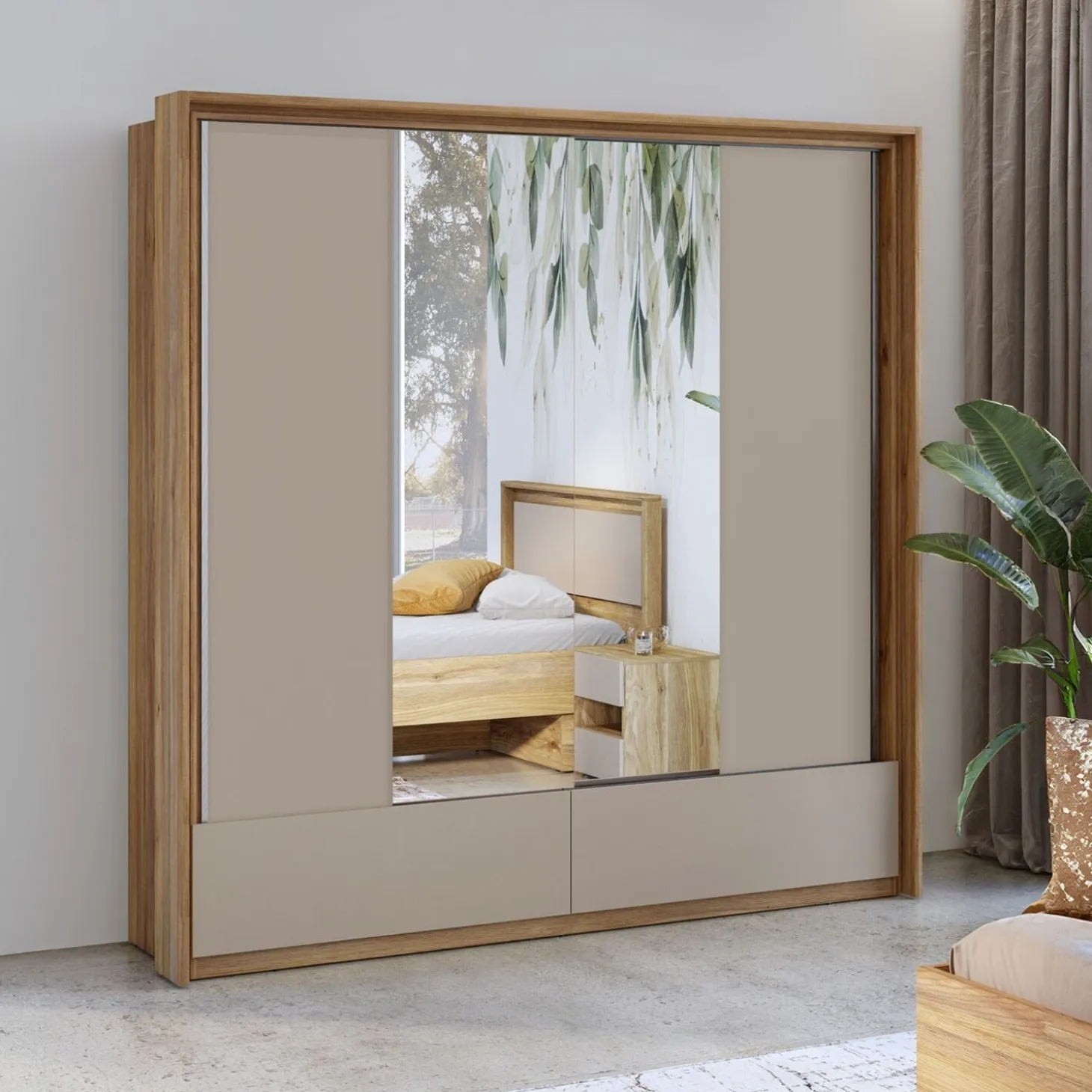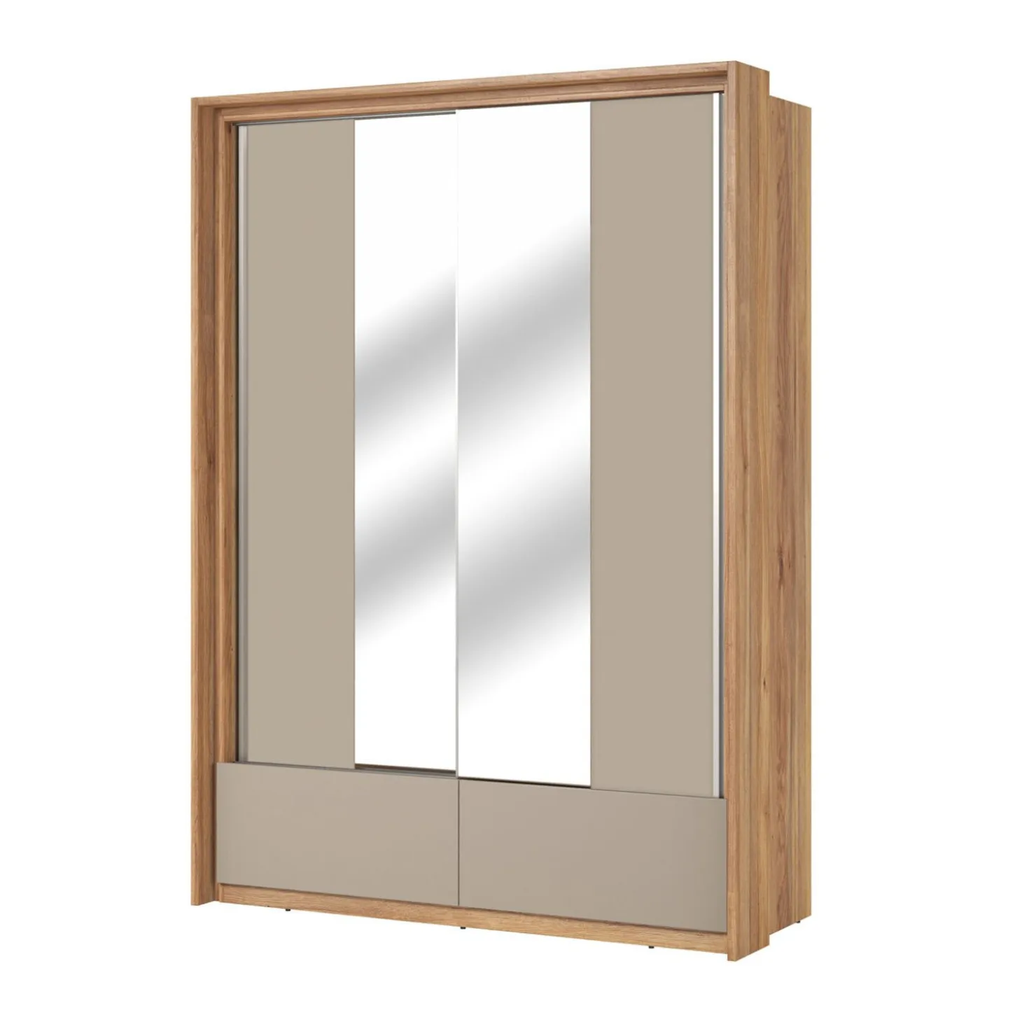 De Kledingkast Imola combineert modern design met slimme opbergruimte. De strakke vormgeving en het warme eikenframe in combinatie met taupe fronten en spiegeldeuren geven deze kast een stijlvolle en eigentijdse uitstraling. Dankzij de schuifdeuren is de kast bovendien ruimtebesparend en ideaal voor zowel grote als kleinere slaapkamers.