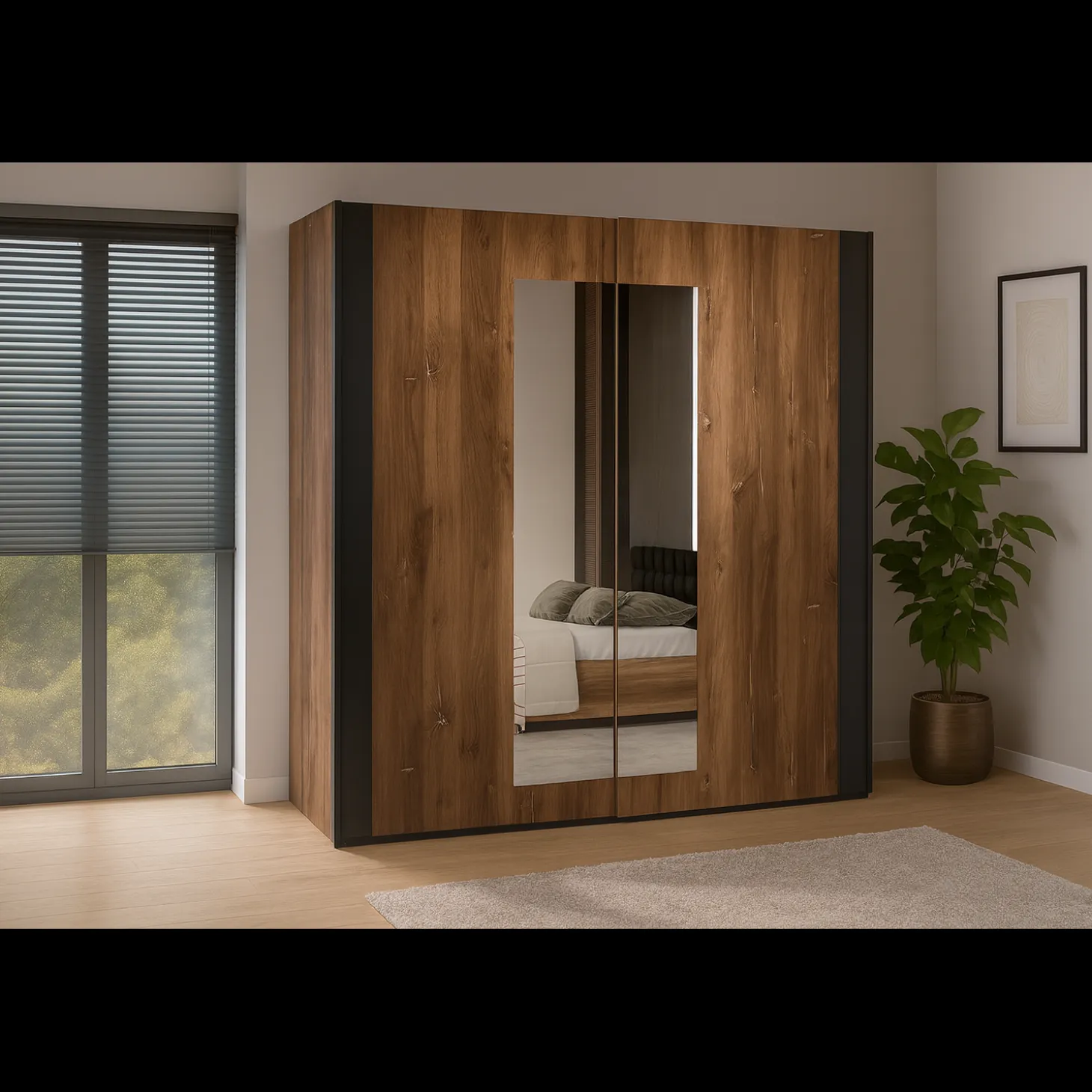 De Kledingkast Siena combineert stoer design met praktische opbergruimte. De warme houtlook in combinatie met de zwarte accenten en dubbele spiegeldeuren geeft de kast een moderne en eigentijdse uitstraling. Dankzij de schuifdeuren is de kast bovendien ruimtebesparend en ideaal voor zowel grote als kleinere slaapkamers.