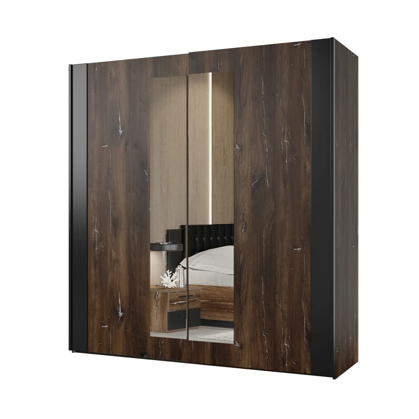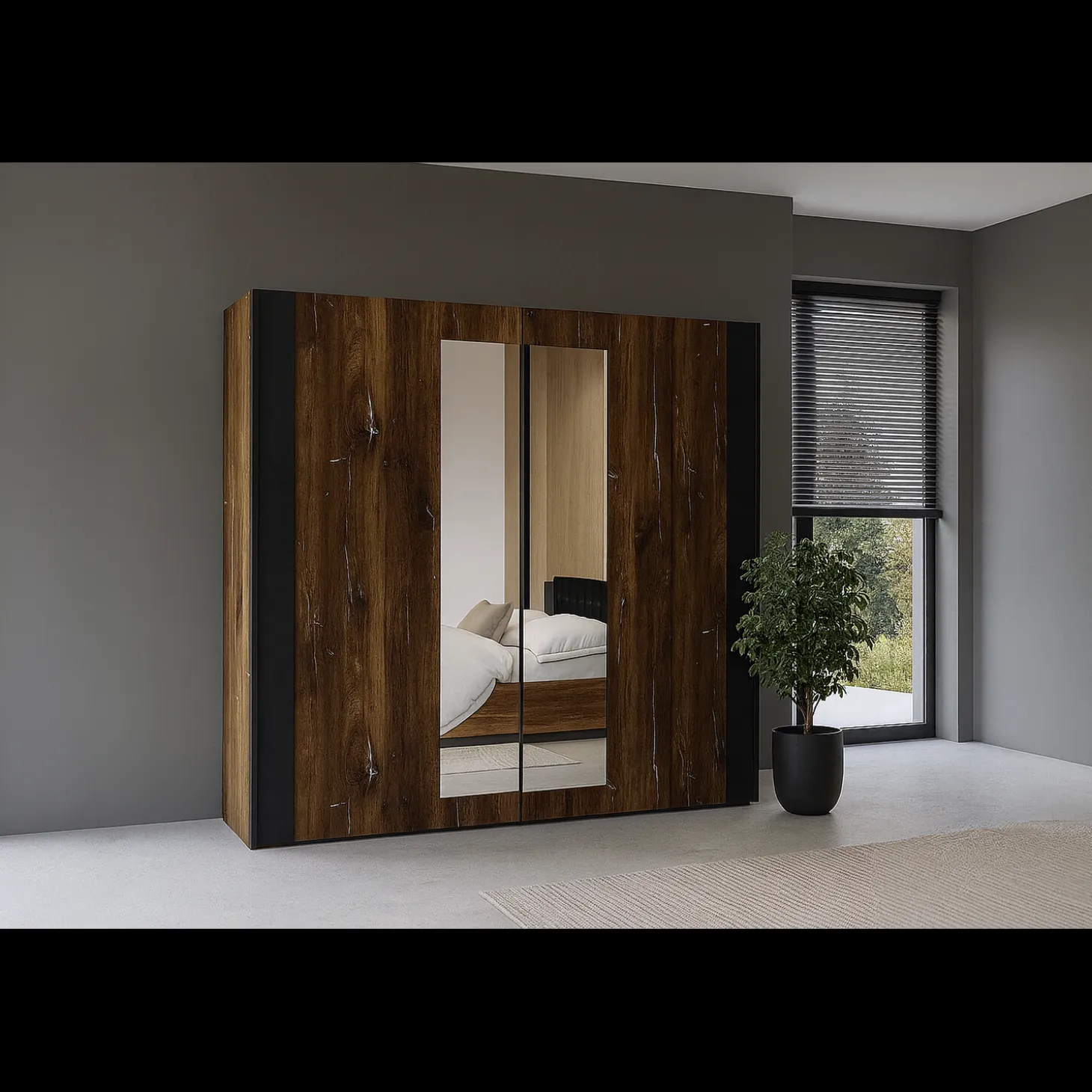 De Kledingkast Siena combineert stoer design met praktische opbergruimte. De warme houtlook in combinatie met de zwarte accenten en dubbele spiegeldeuren geeft de kast een moderne en eigentijdse uitstraling. Dankzij de schuifdeuren is de kast bovendien ruimtebesparend en ideaal voor zowel grote als kleinere slaapkamers.