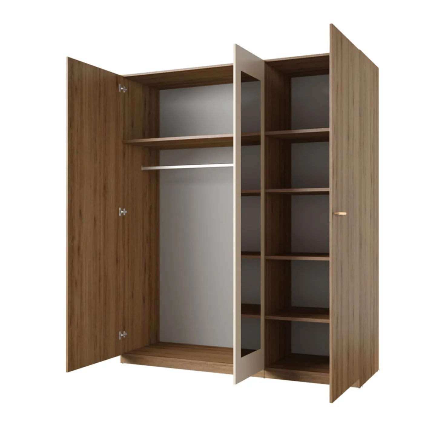 Achter de twee brede deuren bevindt zich een royaal hanggedeelte met kledingroede en bovenplank – ideaal voor jurken, pakken, jassen of overhemden. De derde deur opent naar een serie praktische legplanken, perfect voor het overzichtelijk opbergen van truien, shirts en accessoires.