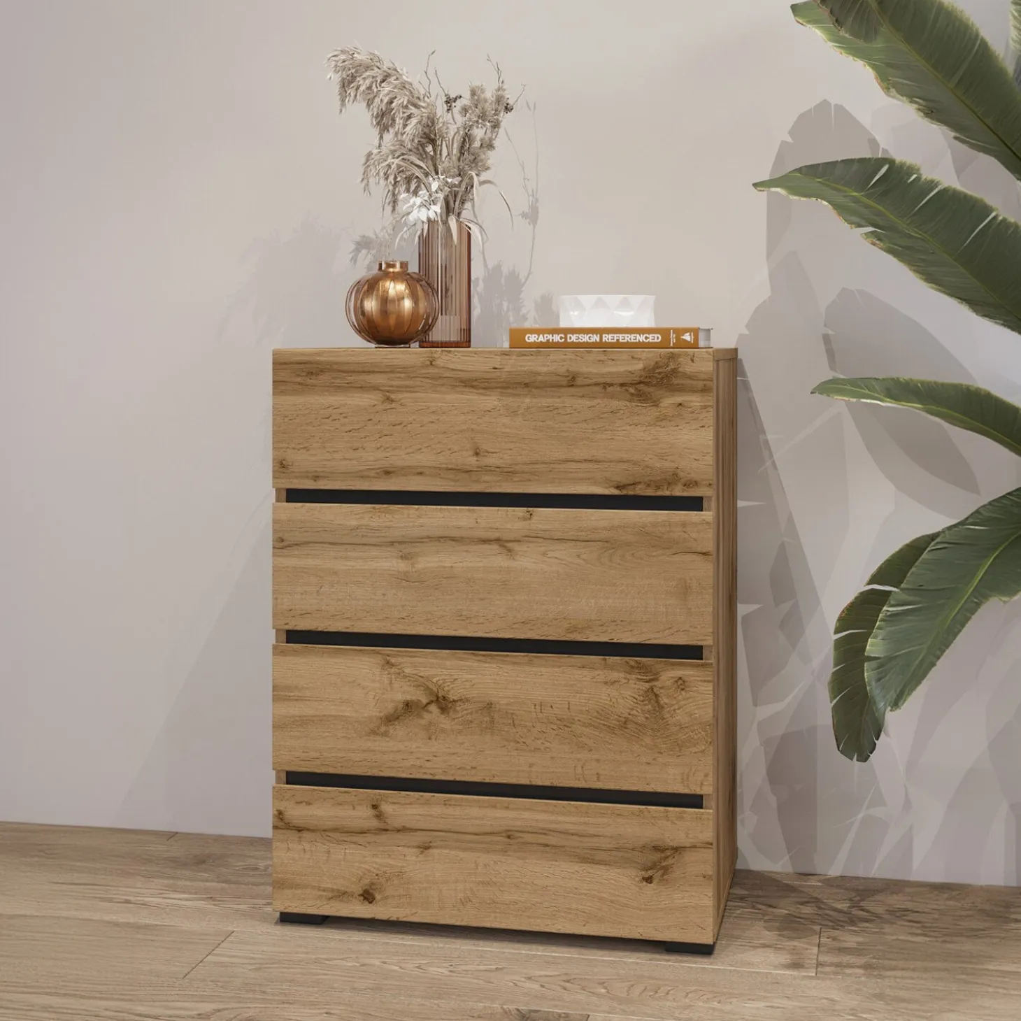 De ladekast Crotone heeft een strak en minimalistisch ontwerp met vier ruime lades. De greeploze fronten en rechte lijnen zorgen voor een rustige en moderne uitstraling, terwijl de indeling praktisch is voor het netjes opbergen van kleding of andere spullen.