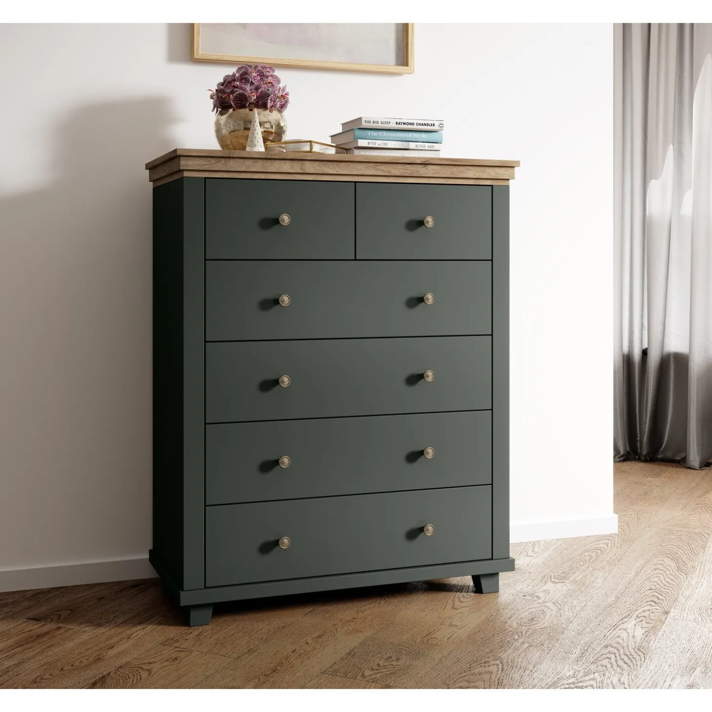 De Ladekast Elvas combineert klassieke charme met een eigentijdse uitstraling. De donkergroene afwerking in combinatie met het warme houten blad geeft deze kast een stijlvolle en rustieke look die perfect past in zowel landelijke als moderne interieurs.