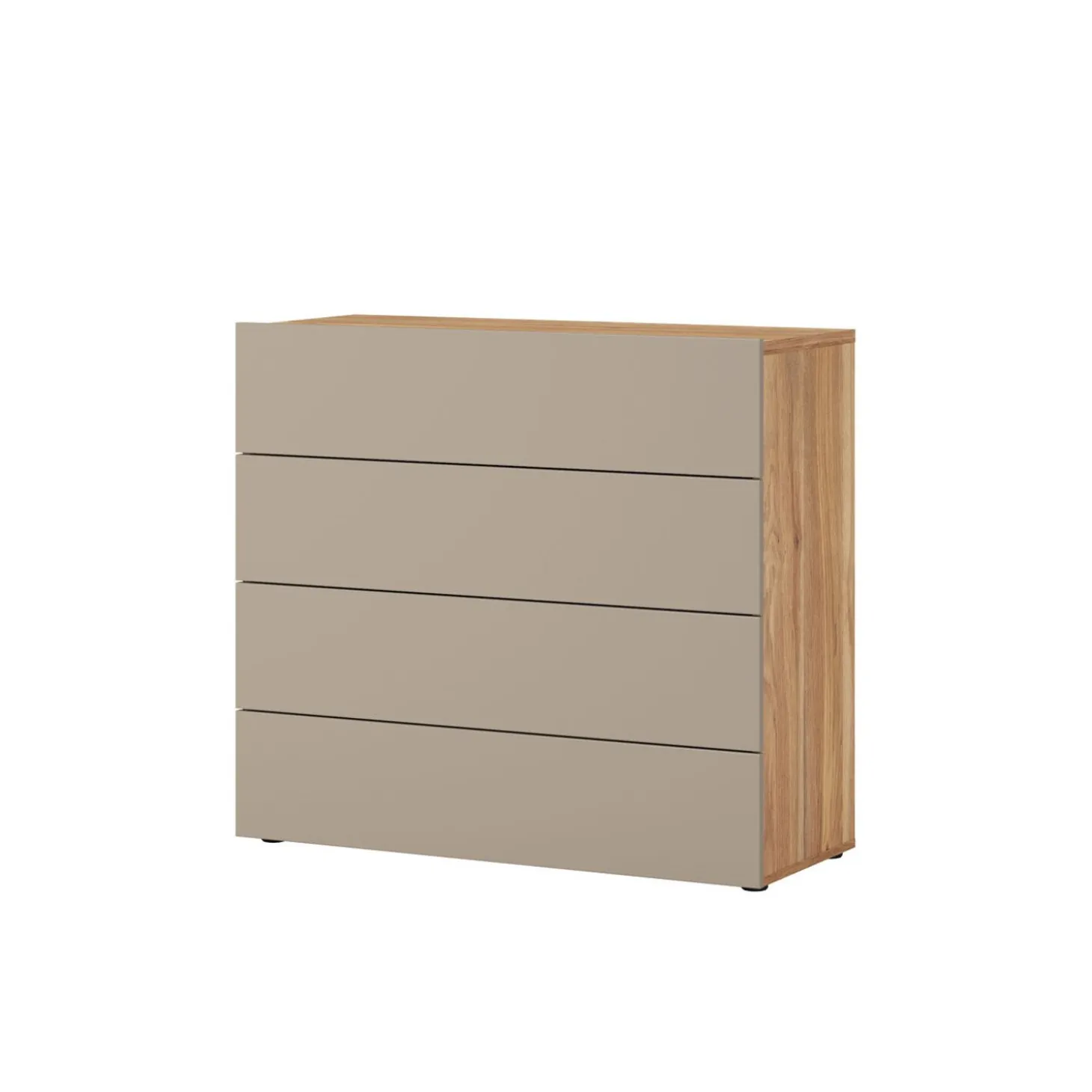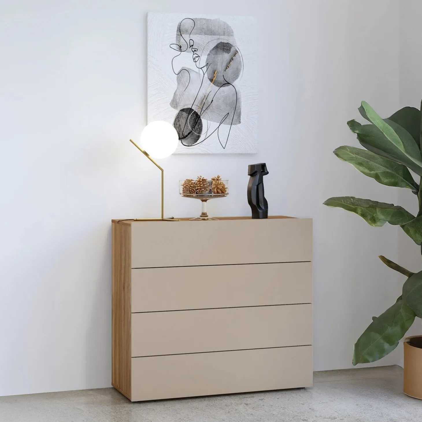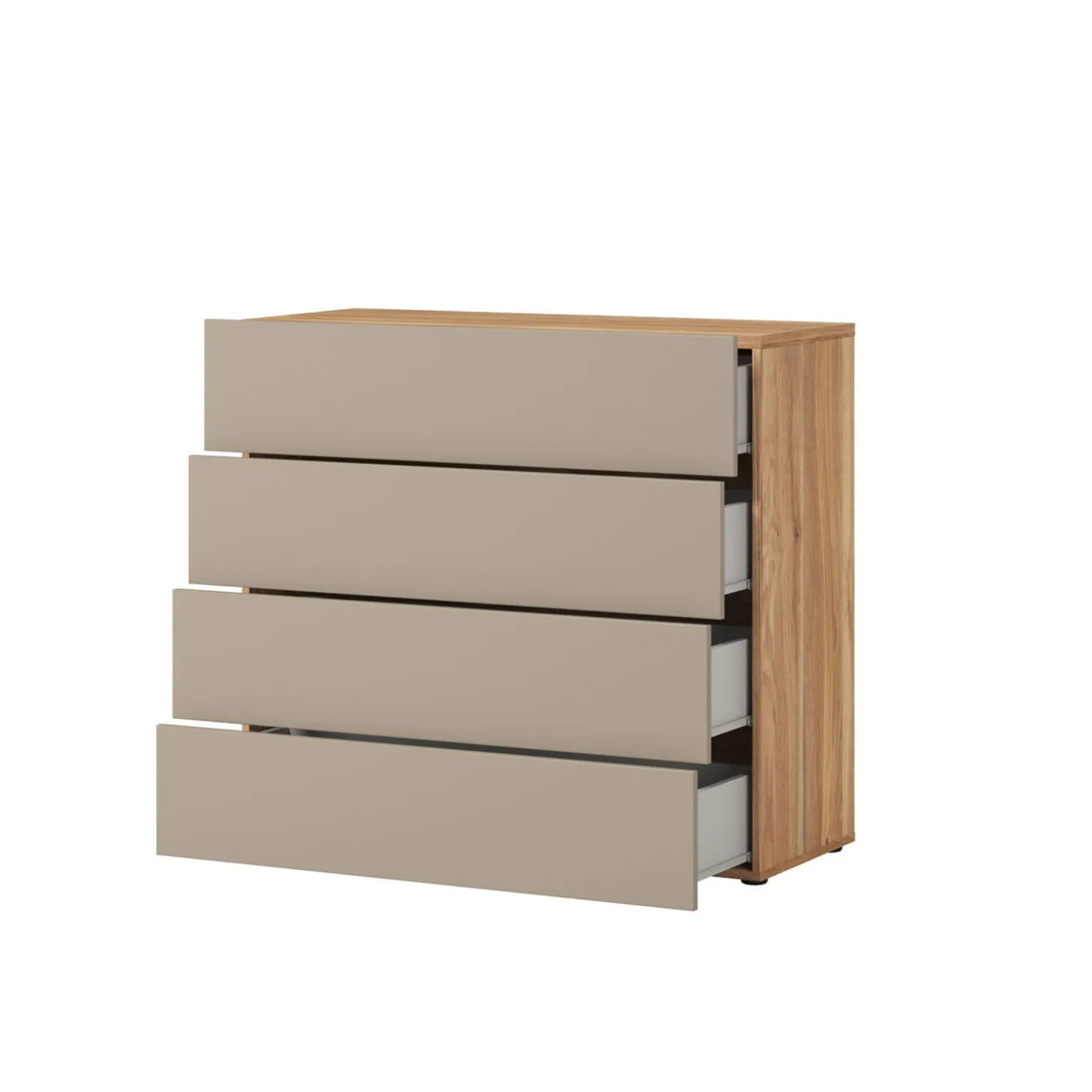De Ladekast Imola straalt moderne eenvoud uit door de combinatie van warme eikenlook en strakke taupekleurige fronten. Het minimalistische ontwerp zonder zichtbare handgrepen zorgt voor een rustig en stijlvol geheel dat moeiteloos past in uiteenlopende interieurs.