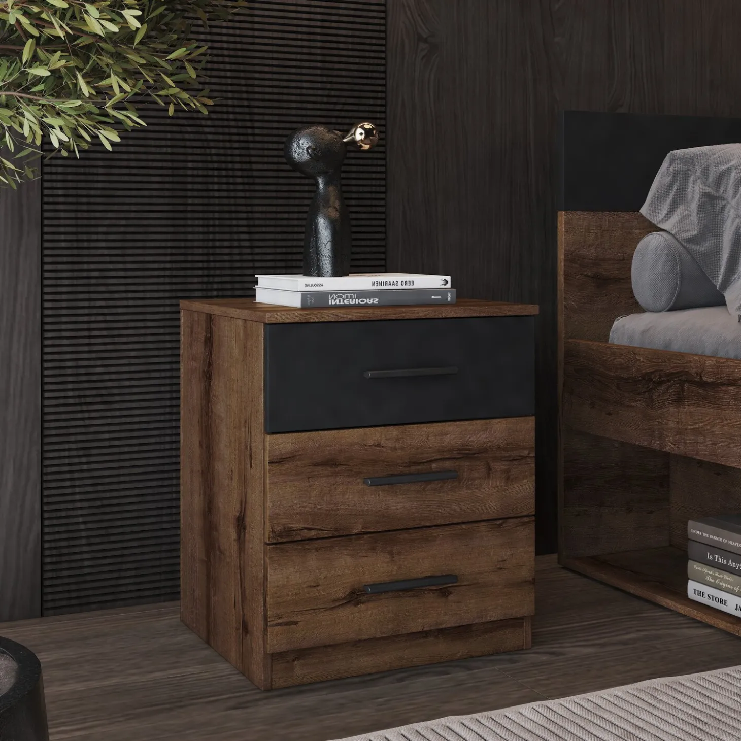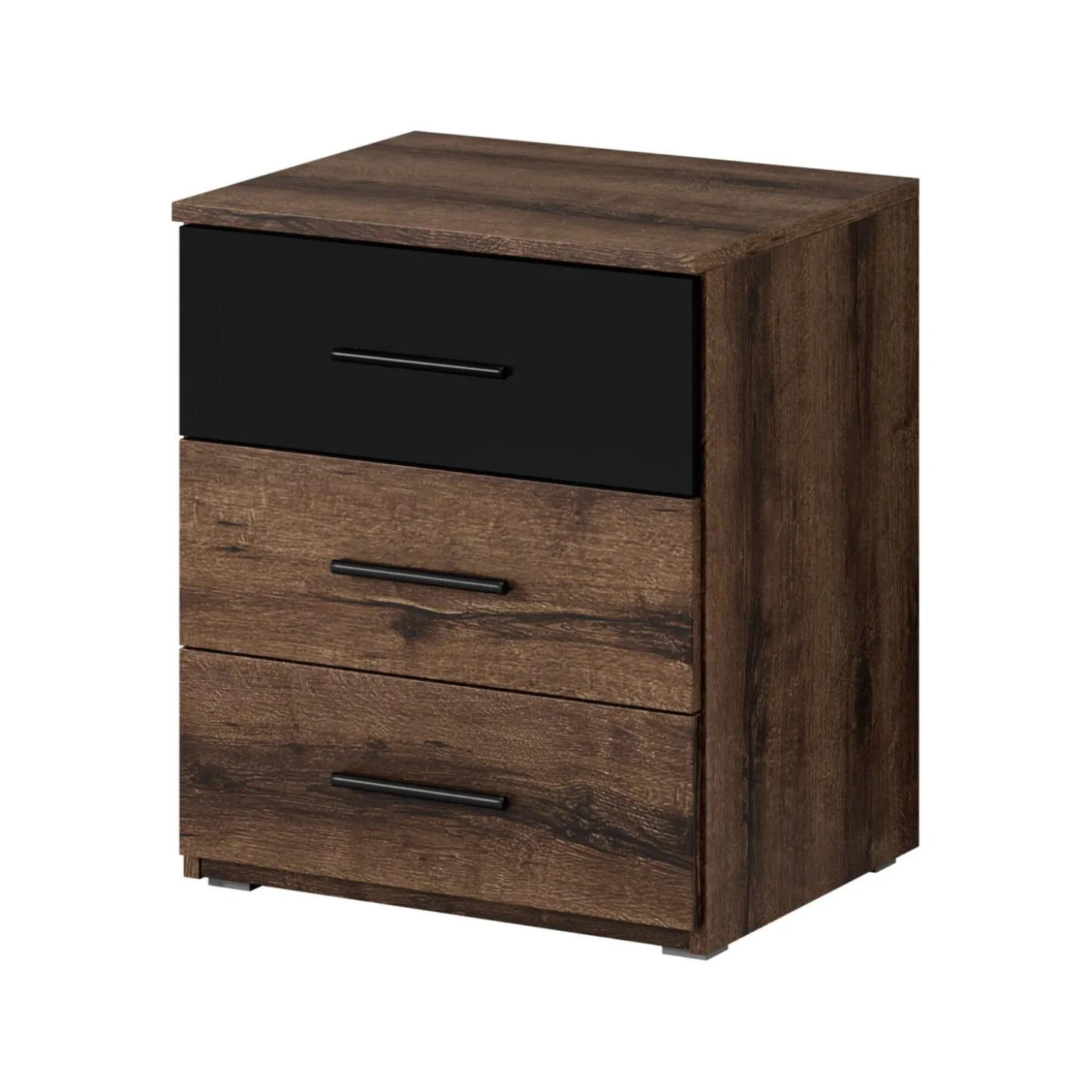 Het Nachtkastje met Lades Bern combineert een strak ontwerp met volop opbergruimte. De combinatie van warme houttinten en een donkere zwarte lade zorgt voor een moderne en tijdloze uitstraling. Met drie ruime lades heb je altijd genoeg plek om boeken, accessoires of andere spullen netjes binnen handbereik en uit het zicht op te bergen.