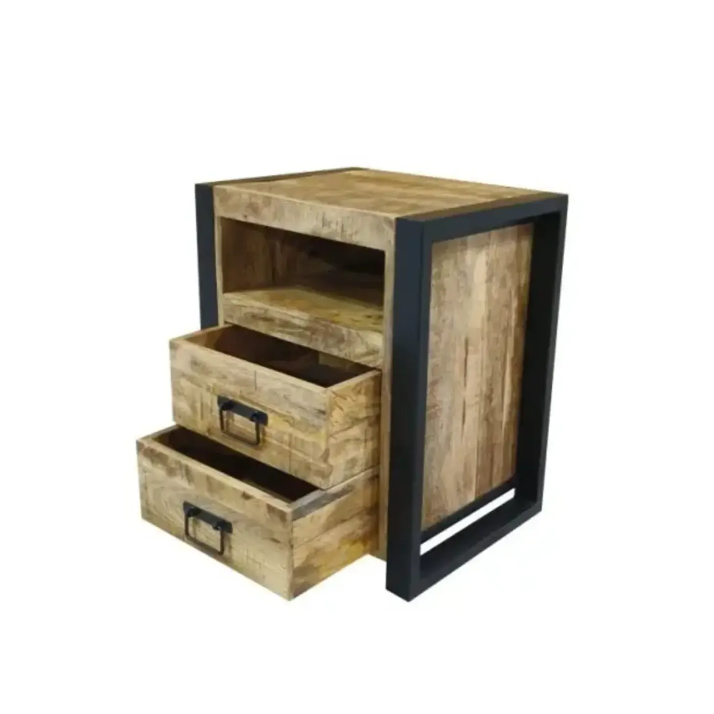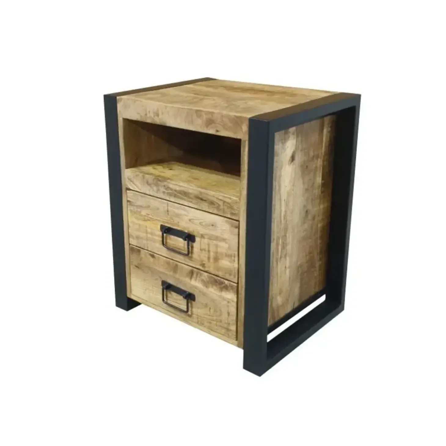 Nachtkastje Tino is de ideale combinatie van design en gebruiksgemak. Gemaakt van robuust mangohout en voorzien van een stevig zwart metalen frame, straalt Tino een industriële charme uit die perfect past in een modern of stoer interieur. Het kastje beschikt over twee praktische lades voor het opbergen van kleine spullen én een open vak voor bijvoorbeeld je favoriete boek, telefoon of decoratie.