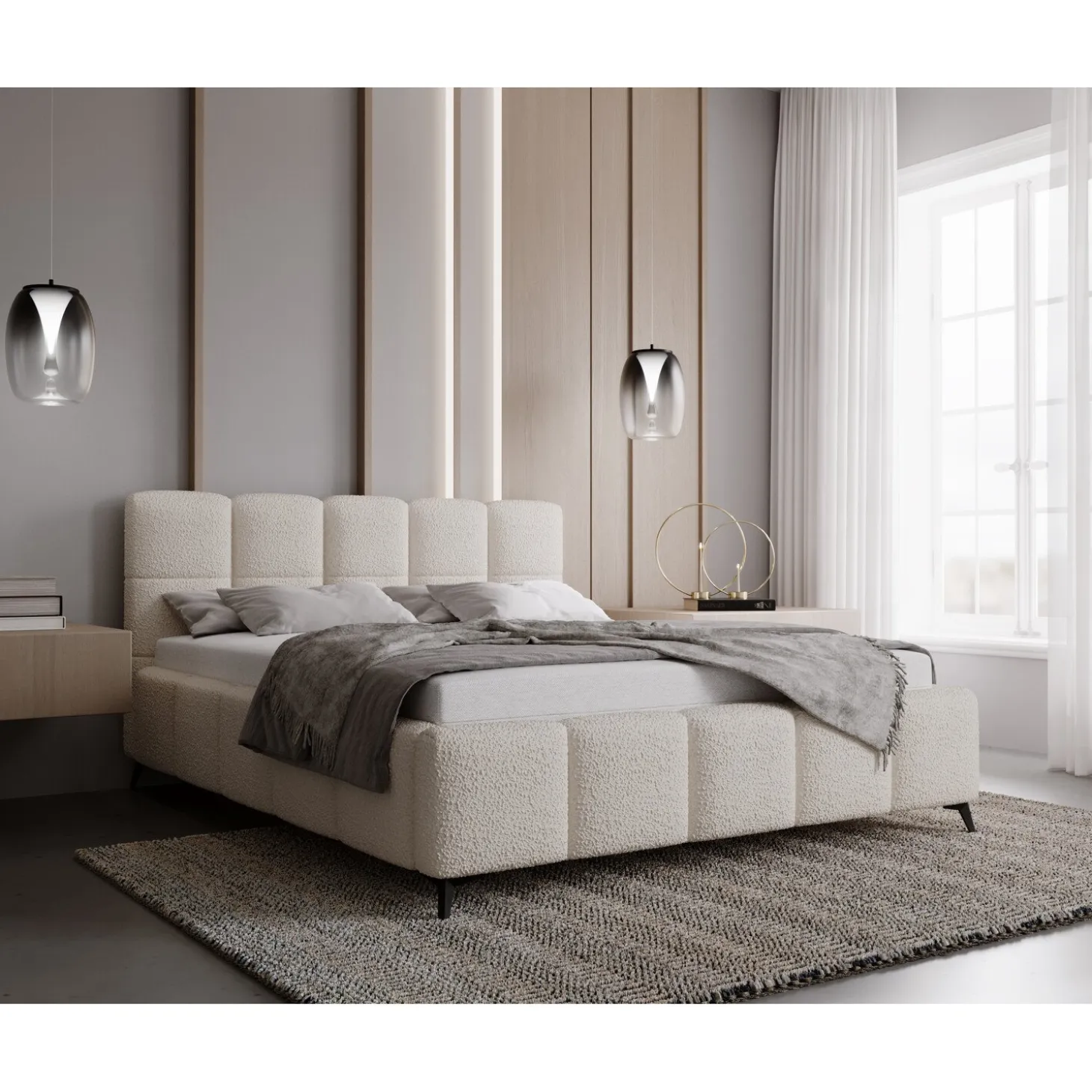 Het hoofdbord van de Nola is afgewerkt met elegante bolle stikvakken die zorgen voor een luxe en comfortabele uitstraling. Samen met de strakke bedomlijsting en de verfijnde meubelpoten vormt dit een stijlvol geheel dat de slaapkamer direct meer klasse geeft.