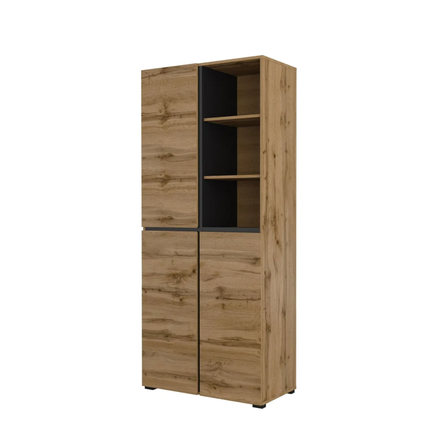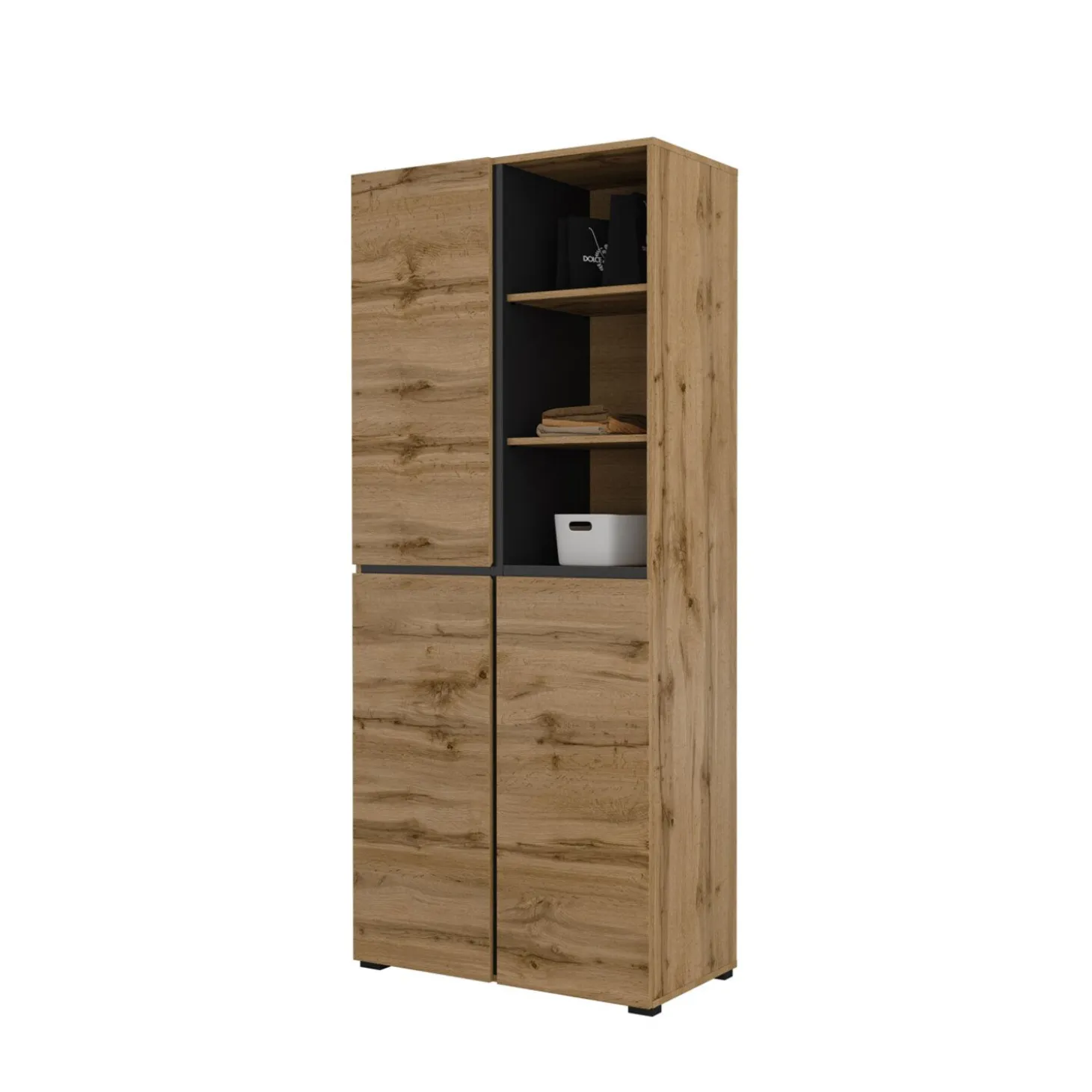 De opbergkast Crotone heeft een strak en modern ontwerp met een combinatie van gesloten vakken en open opbergruimte. Het open gedeelte met legplanken biedt plek voor spullen die je graag binnen handbereik houdt, terwijl de kastdeuren zorgen voor een rustig en opgeruimd geheel. De rechte lijnen en greeploze afwerking geven de kast een nette en eigentijdse uitstraling.