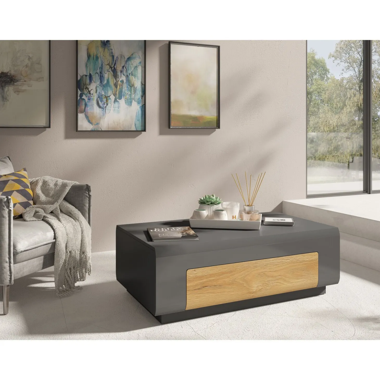 De Salontafel Torben straalt moderne elegantie uit met zijn strakke lijnen en bijzondere materiaalcombinatie. Het diepe grijs geeft de tafel een luxe uitstraling, terwijl het warme houtaccent voor een natuurlijke balans zorgt. Dankzij de ruime lade heb je altijd plek om spullen netjes uit het zicht op te bergen.
