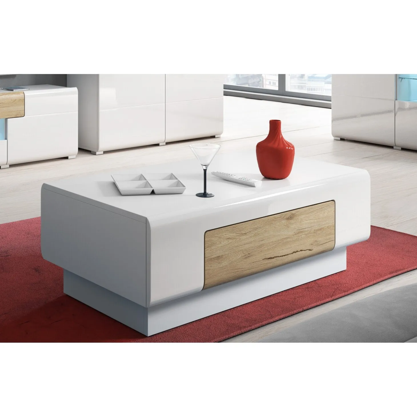 De Salontafel Torben straalt moderne elegantie uit met zijn strakke lijnen en bijzondere materiaalcombinatie. Het diepe wit geeft de tafel een luxe uitstraling, terwijl het warme houtaccent voor een natuurlijke balans zorgt. Dankzij de ruime lade heb je altijd plek om spullen netjes uit het zicht op te bergen.