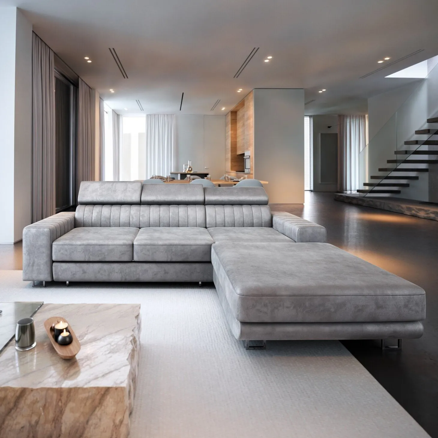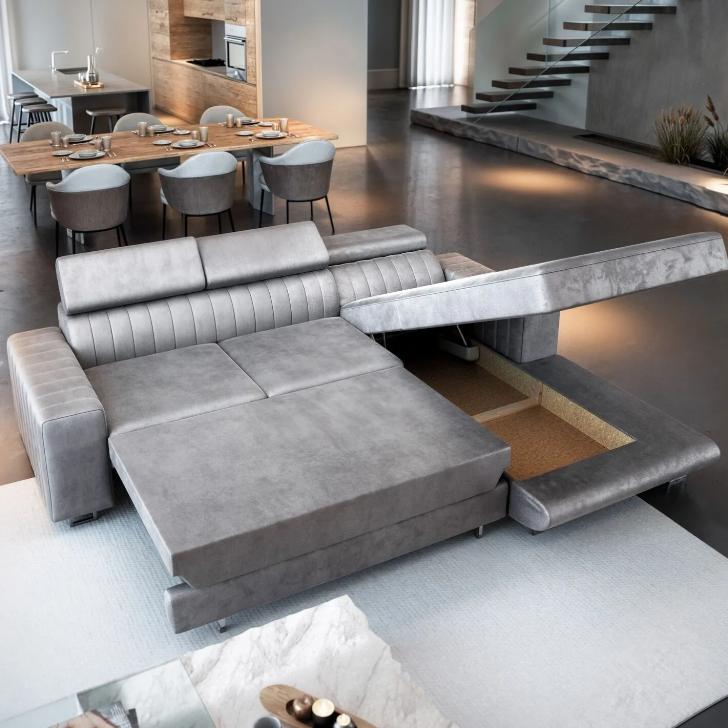 Slaapbank met opbergruimte Nero is een verfijnde en praktische aanwinst voor je woning. Het is een hoekbank die makkelijk omgevormd kan worden tot een comfortabele slaapplaats. Het opvallende ontwerp maakt hem aanpasbaar aan de specifieke eisen van jouw ruimte en de ingebouwde opbergvoorzieningen bieden bijvoorbeeld een plek voor je beddengoed.