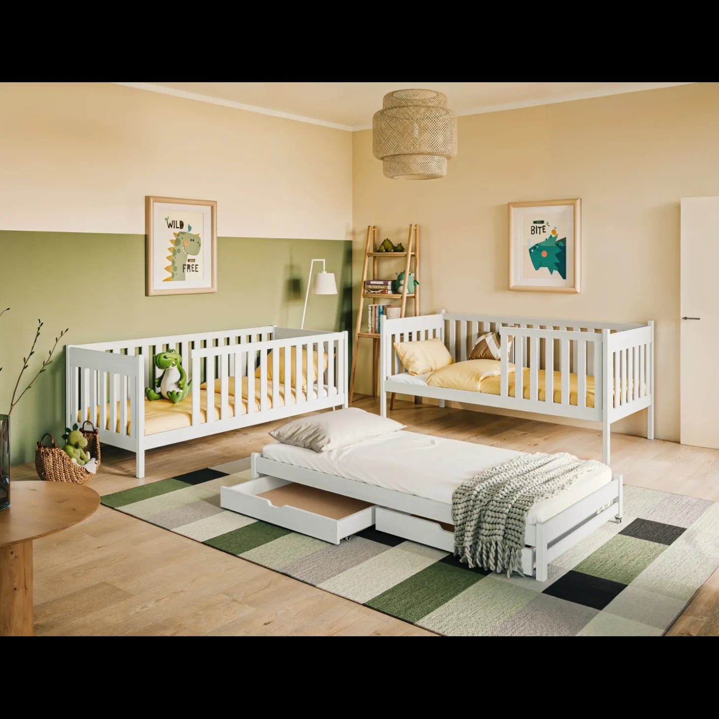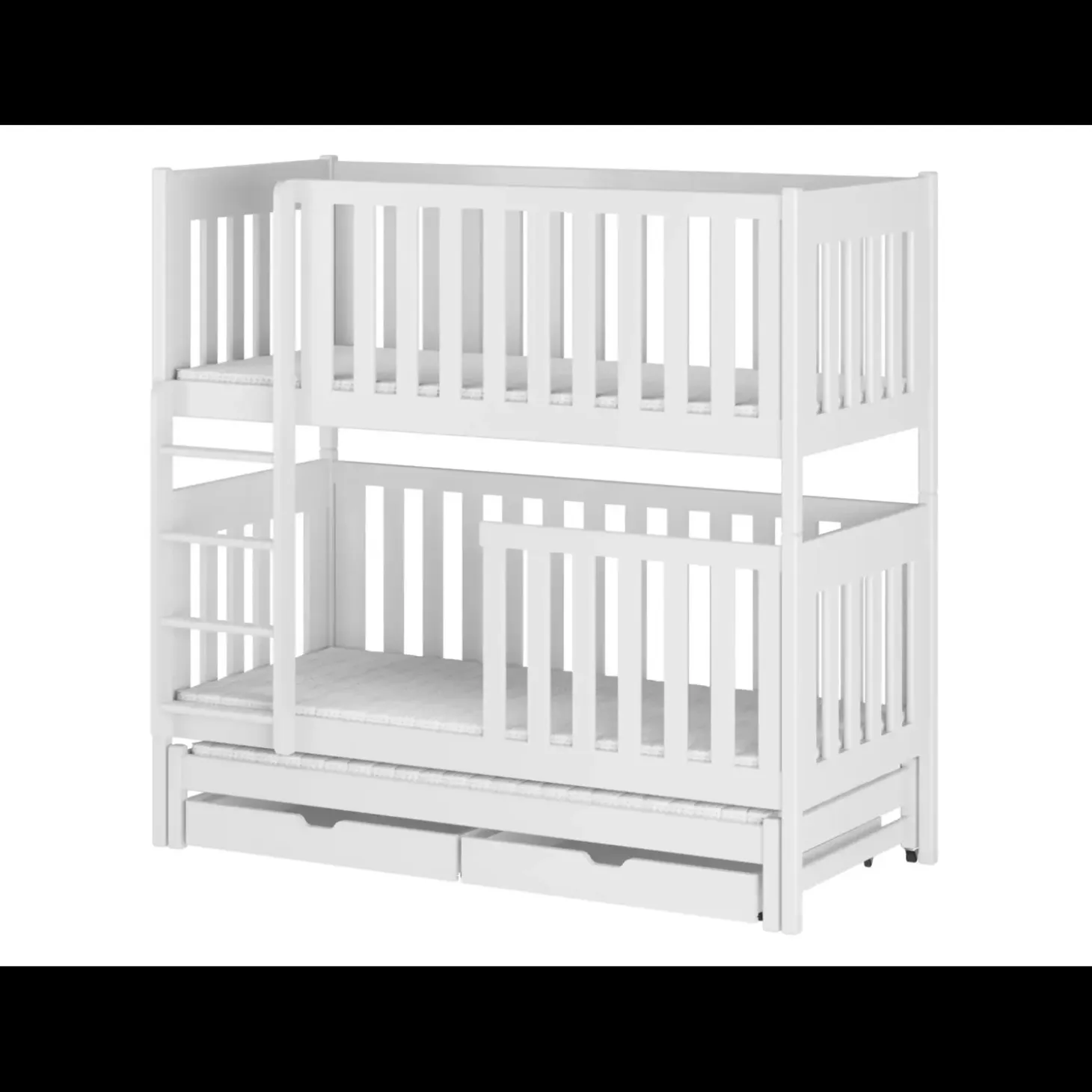 Het stapelbed Emiel heeft een strak en functioneel ontwerp met rondom rechte spijlen en een duidelijke opbouw in lagen. De twee slaapniveaus worden aangevuld met een extra uitschuifbaar bed en praktische opberglades onderin. Hierdoor ontstaat een complete en ruimtebesparende oplossing waarin slapen en opbergen slim gecombineerd zijn.