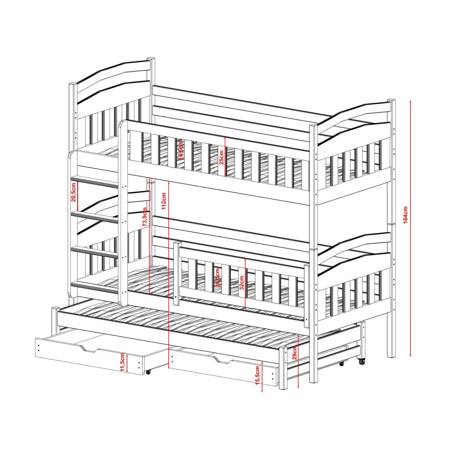 Dit stapelbed voor 3 kinderen is een slimme keuze bij beperkte ruimte. Het biedt drie aparte slaapplekken, zodat elk kind comfortabel en veilig slaapt. Dankzij de stevige constructie en kindvriendelijke afwerking past het perfect in elke kinderkamer.