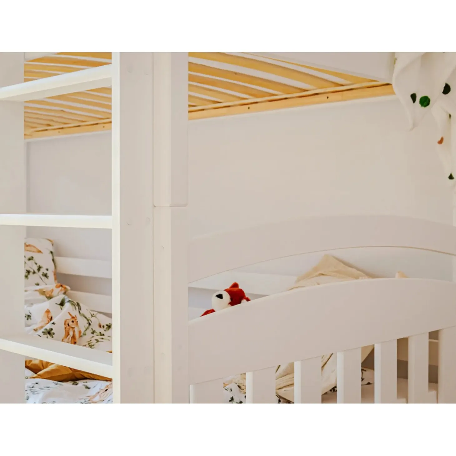 Stapelbed Ilias voor 2 kinderen is een praktische keuze als je ruimte wilt besparen maar wel twee aparte slaapplekken nodig hebt. De bedden boven elkaar besparen kostbare ruimte, en de opberglade onder het bed biedt extra plek voor speelgoed, beddengoed of kleding. Ideaal voor broertjes, zusjes of logees.