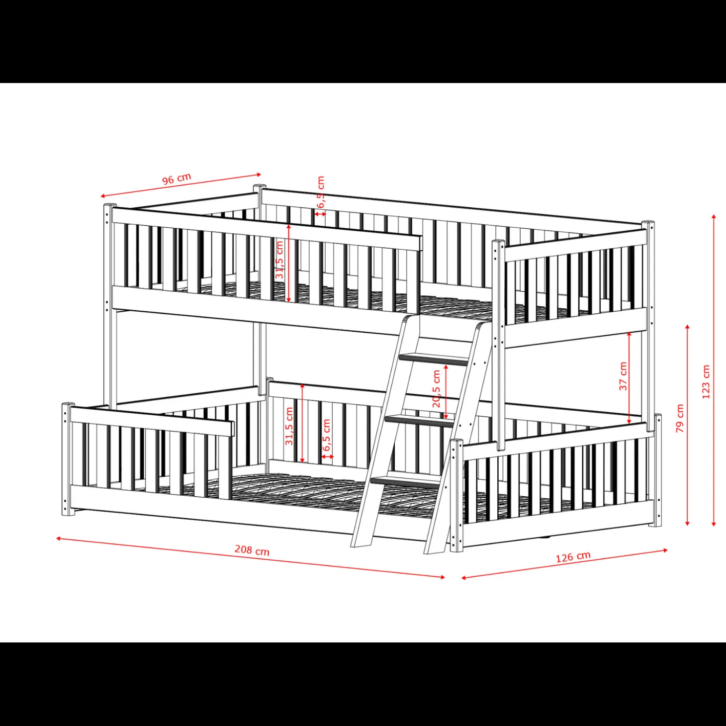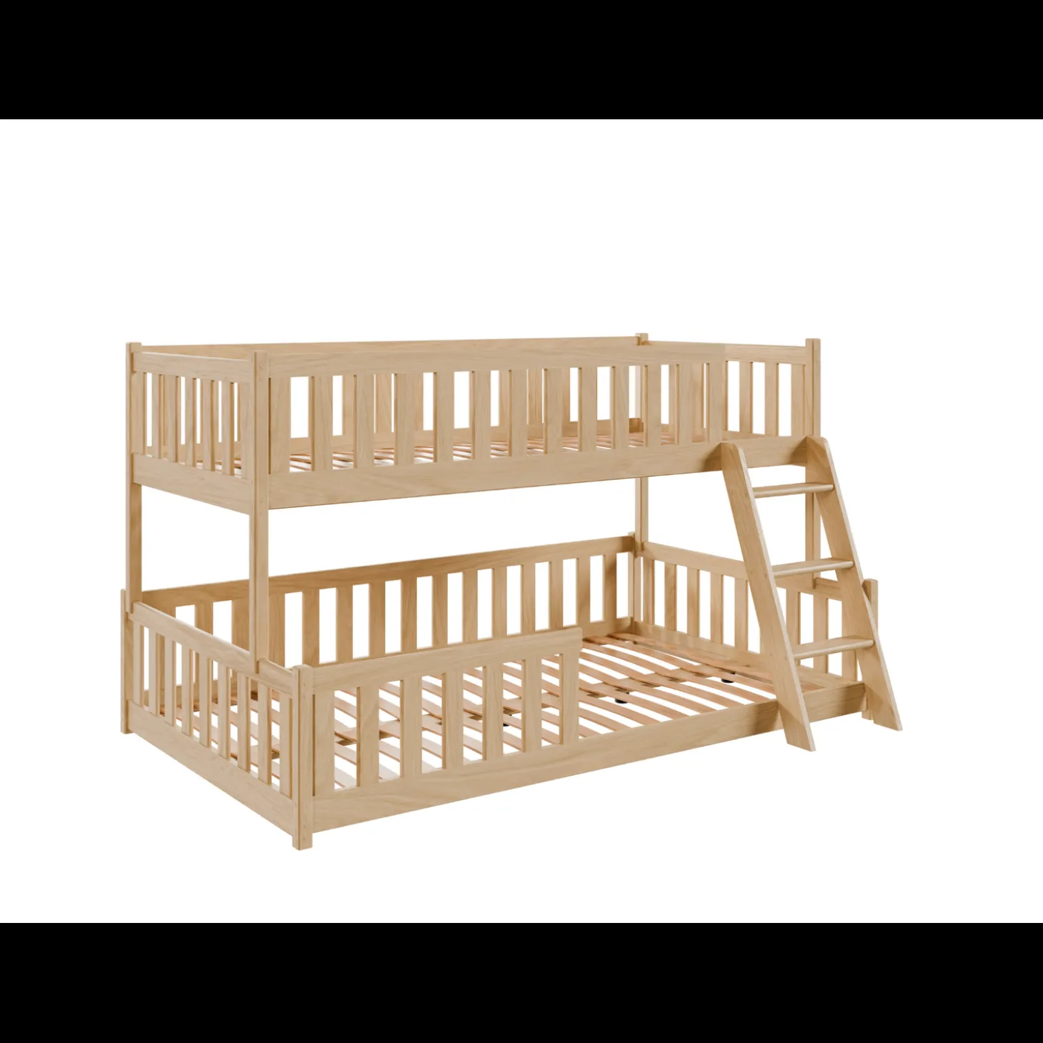 Het stapelbed Niels heeft een frisse en open uitstraling met rechte lijnen en rondom geplaatste spijlen. De twee slaaplagen zijn praktisch boven elkaar geplaatst, waarbij de onderste laag lager bij de grond ligt voor extra toegankelijkheid. De stevige ladder aan de voorkant zorgt voor een duidelijke en veilige toegang tot het bovenbed, terwijl het geheel luchtig blijft ogen in de ruimte.