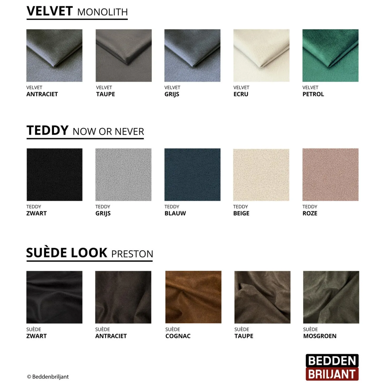Kies uit verschillende stoffen en kleuren en creëer jouw ideale samenstelling in je favoriete stijl. Let op, online is de kleurkeuze beperkt. In onze showroom kun je kiezen uit meer dan 1500+ combinaties en de boxspring volledig naar wens personaliseren.
