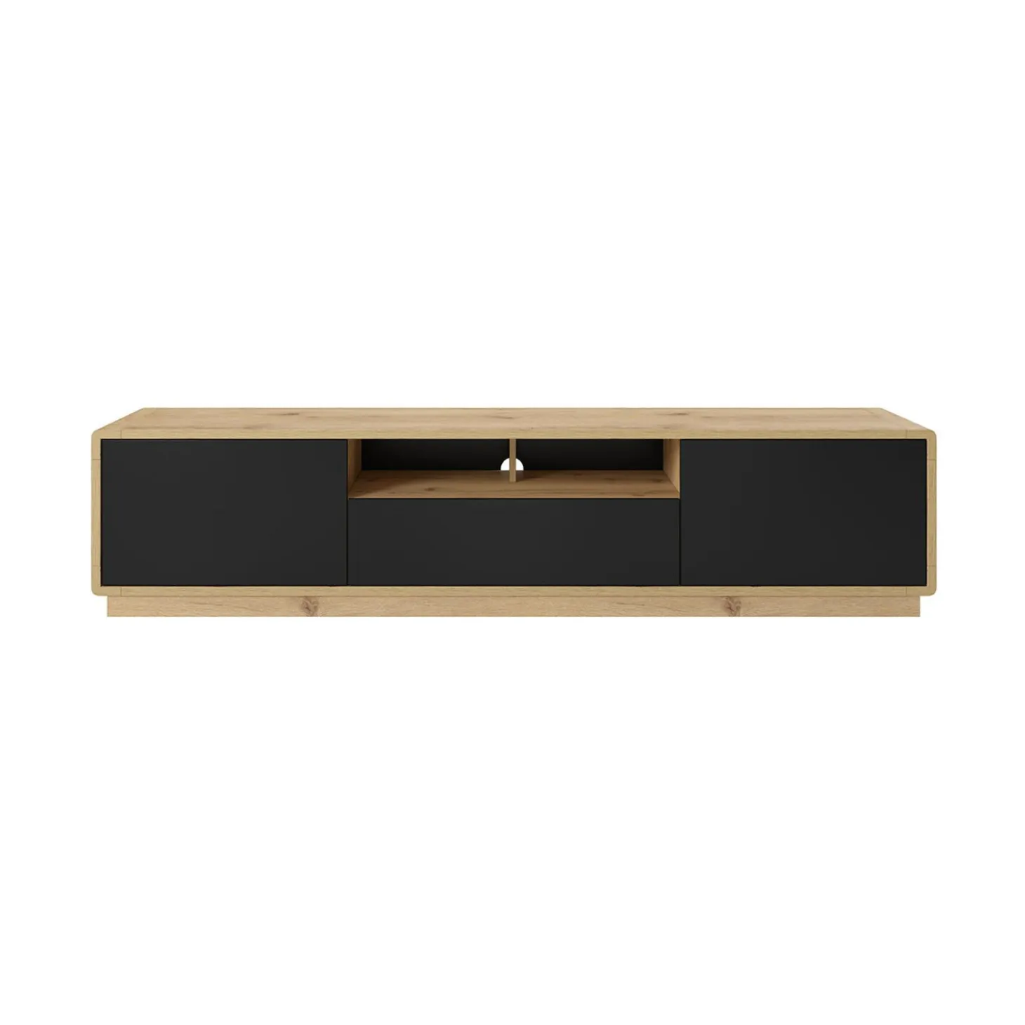 TV-meubel Asmund heeft een strak en krachtig ontwerp met een duidelijke omlijsting rondom het front. De lage, brede vorm zorgt voor rust aan de wand, terwijl het open middengedeelte het meubel visueel lichter maakt. De combinatie van twee gesloten deuren en een centrale lade geeft het geheel een evenwichtige en functionele opbouw.