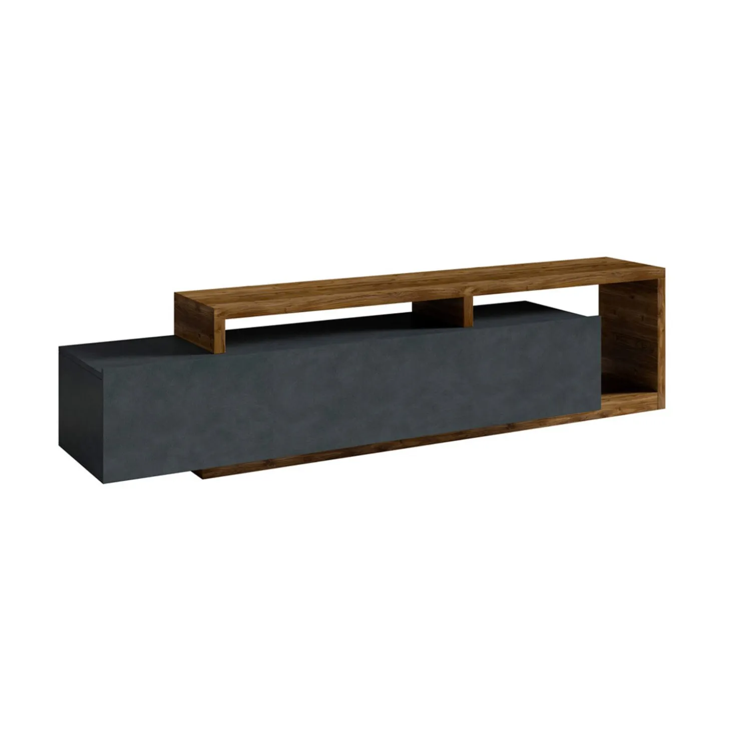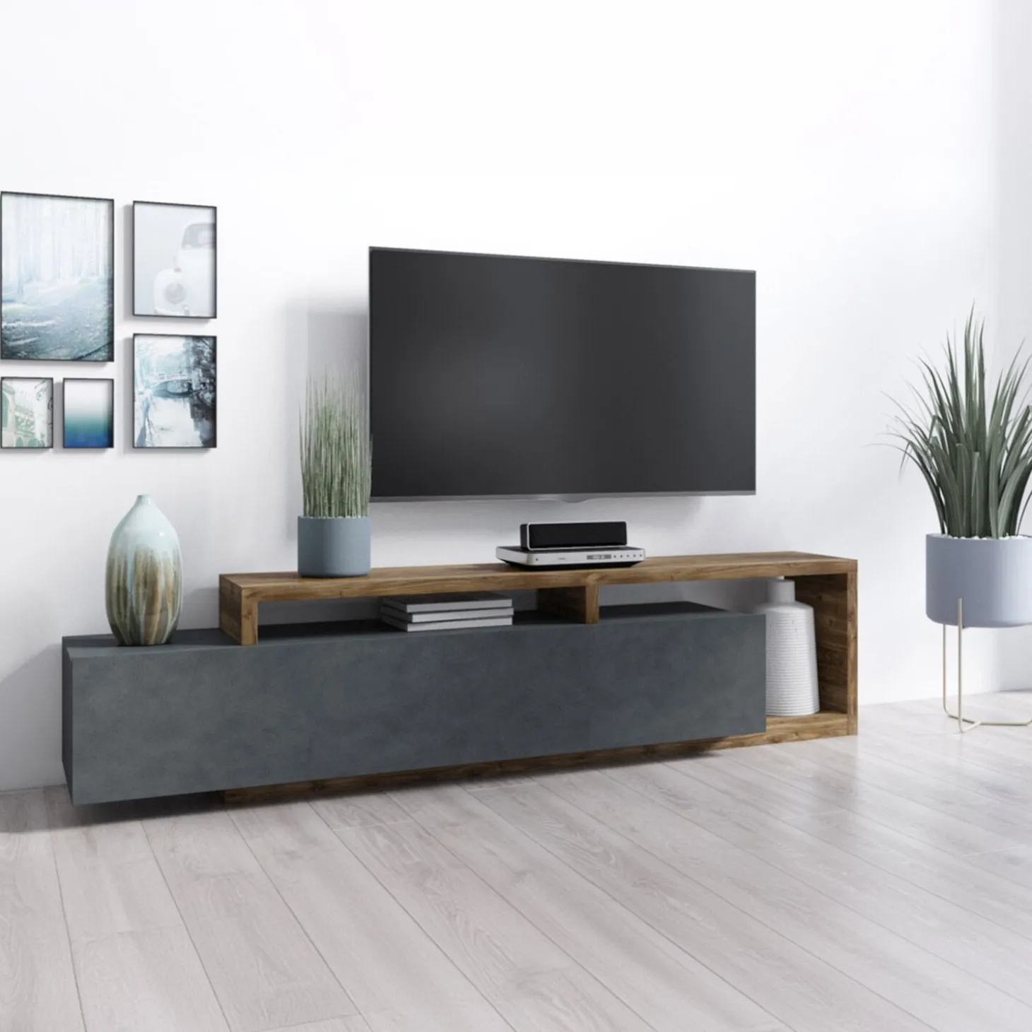 TV-meubel Bologna valt op door zijn lange, lage vorm en het speelse contrast tussen het open kader en het gesloten front. Het bovenblad rust op subtiele staanders, waardoor er een open vak ontstaat dat lucht en diepte toevoegt aan het ontwerp. De combinatie van strakke lijnen en een robuuste basis zorgt voor een moderne uitstraling die rust brengt in de woonkamer.