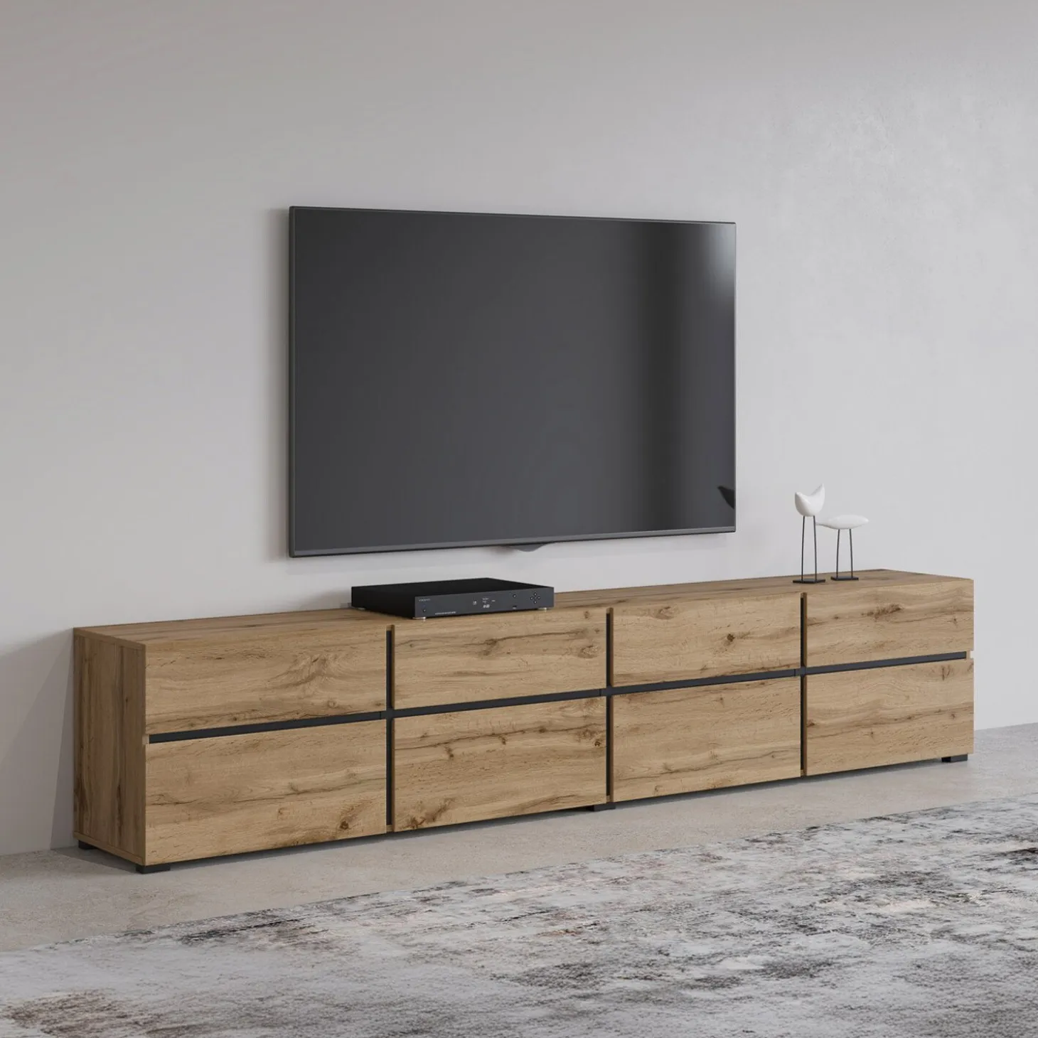 TV-meubel Crotone heeft een extra brede en krachtige uitstraling dankzij de doorlopende horizontale vorm en de strakke, symmetrische opbouw. Het lage silhouet zorgt voor rust onder de televisie en benadrukt de breedte van de wand. De acht fronten zijn gelijkmatig verdeeld en worden visueel verbonden door een subtiele horizontale lijn, wat zorgt voor een modern en evenwichtig geheel met een duidelijke structuur.
