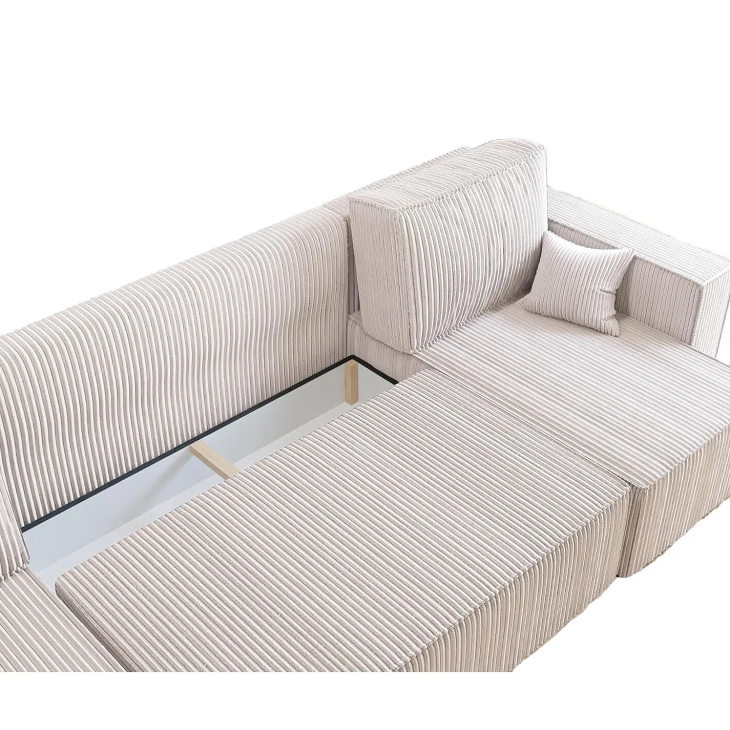 Onder het zitgedeelte bevindt zich een ruime opbergbox die makkelijk bereikbaar is. Perfect voor het opbergen van dekens, kussens of andere spullen. Zo blijft je woonruimte netjes en opgeruimd.