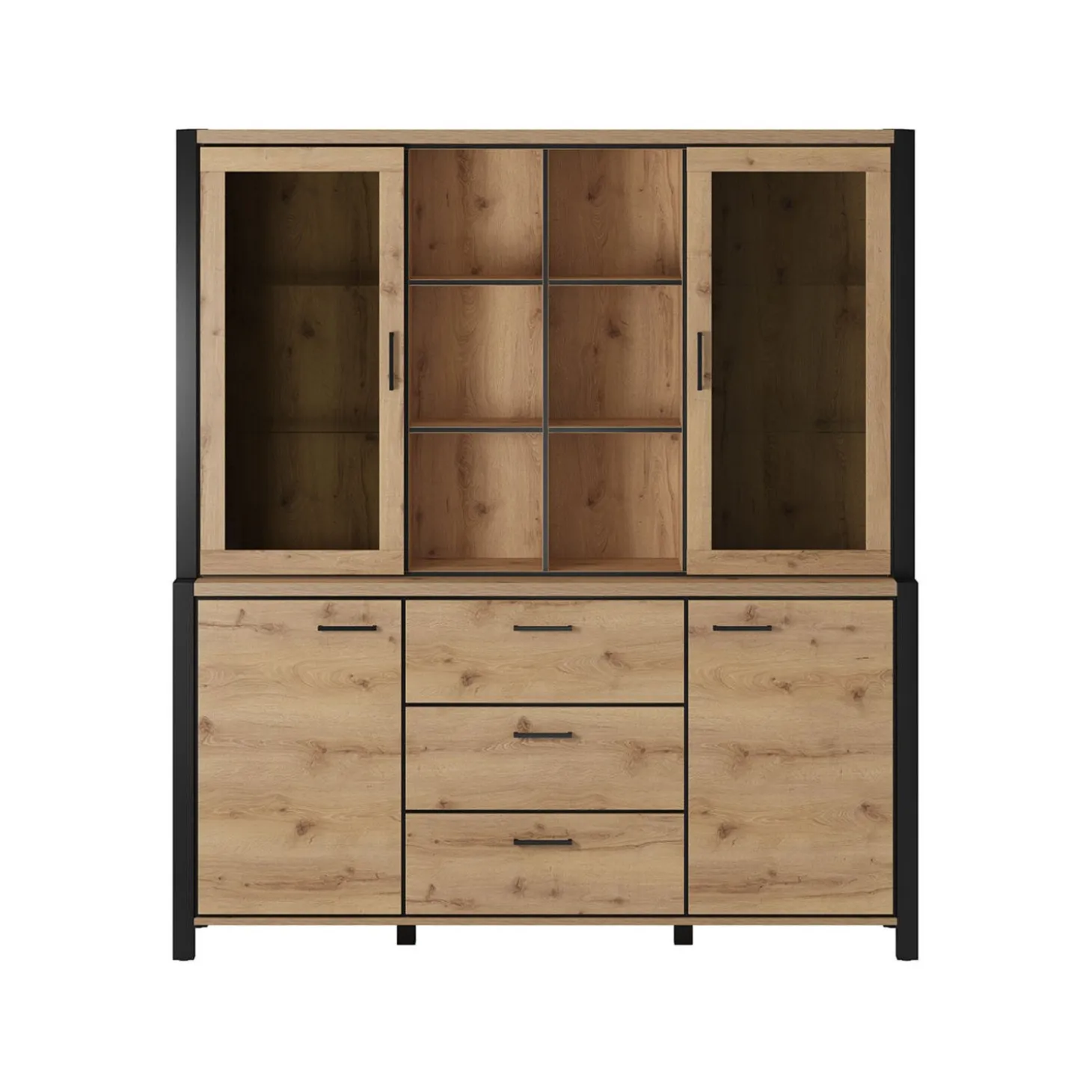 De vitrinekast Akven heeft een robuuste en moderne uitstraling met een duidelijke en symmetrische indeling. De combinatie van vitrinedeuren, open vakken en gesloten opbergruimte maakt deze kast praktisch en geschikt om zowel spullen op te bergen als decoratie te tonen.