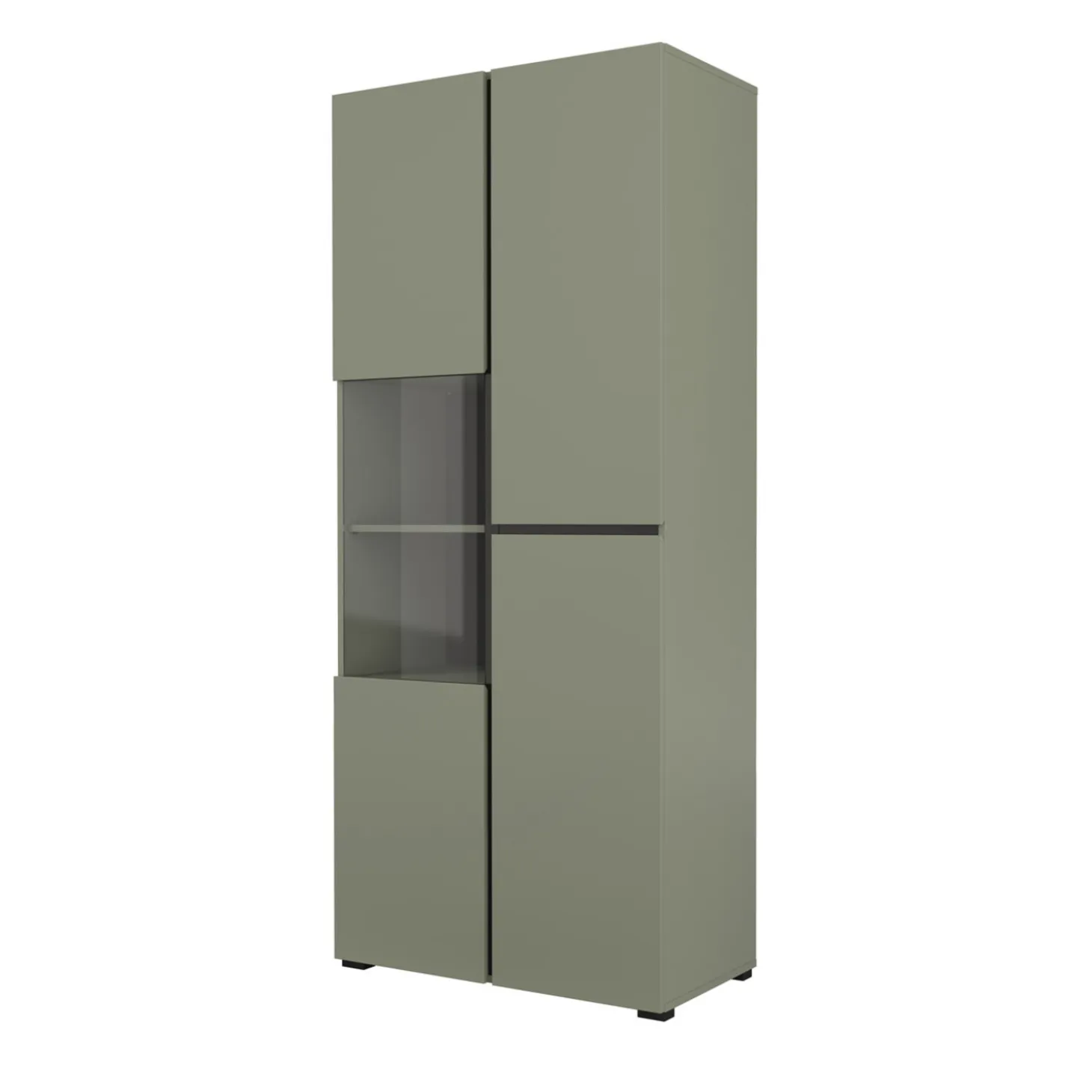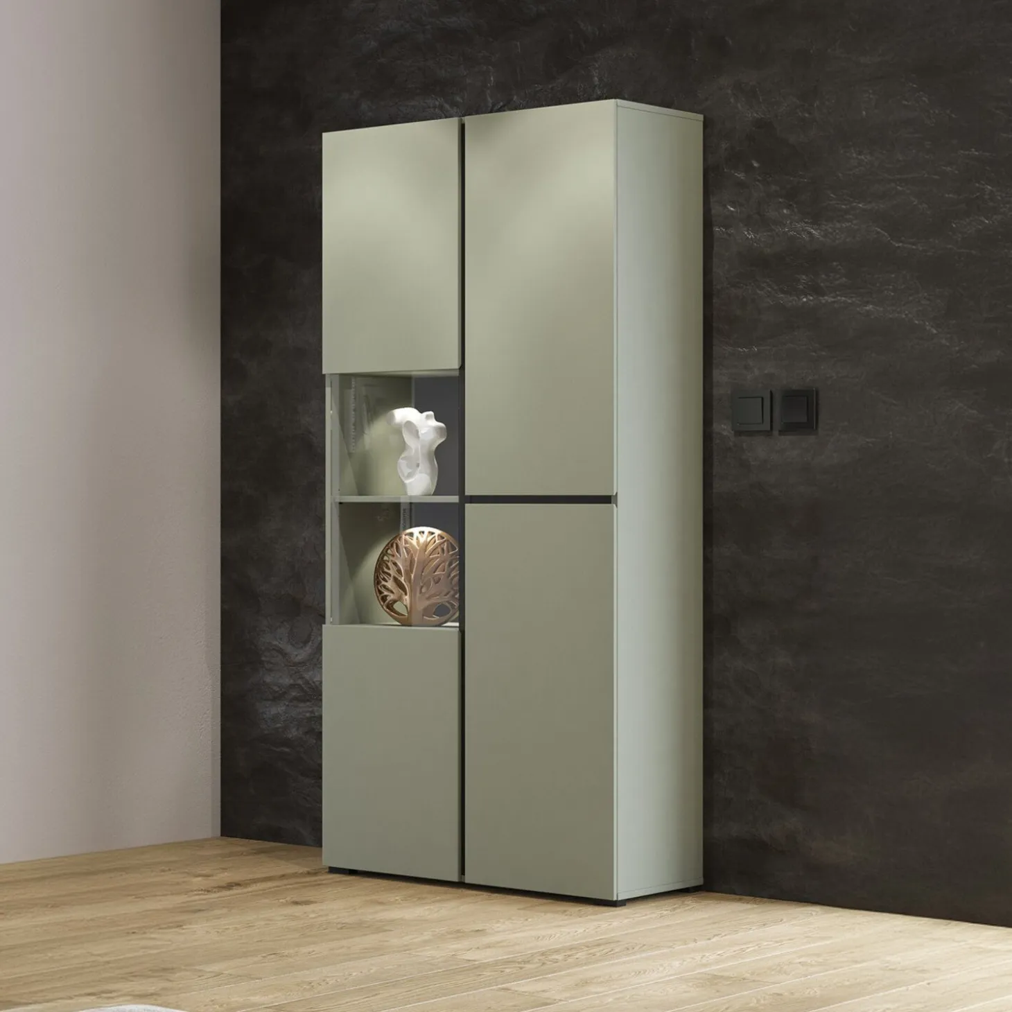 De vitrinekast Crotone heeft een strak en modern ontwerp met een combinatie van gesloten fronten en een open displayvak. Het open gedeelte biedt ruimte om accessoires zichtbaar neer te zetten, terwijl de overige vakken zorgen voor praktische opbergruimte. De rechte lijnen en greeploze afwerking geven de kast een rustige en eigentijdse uitstraling.